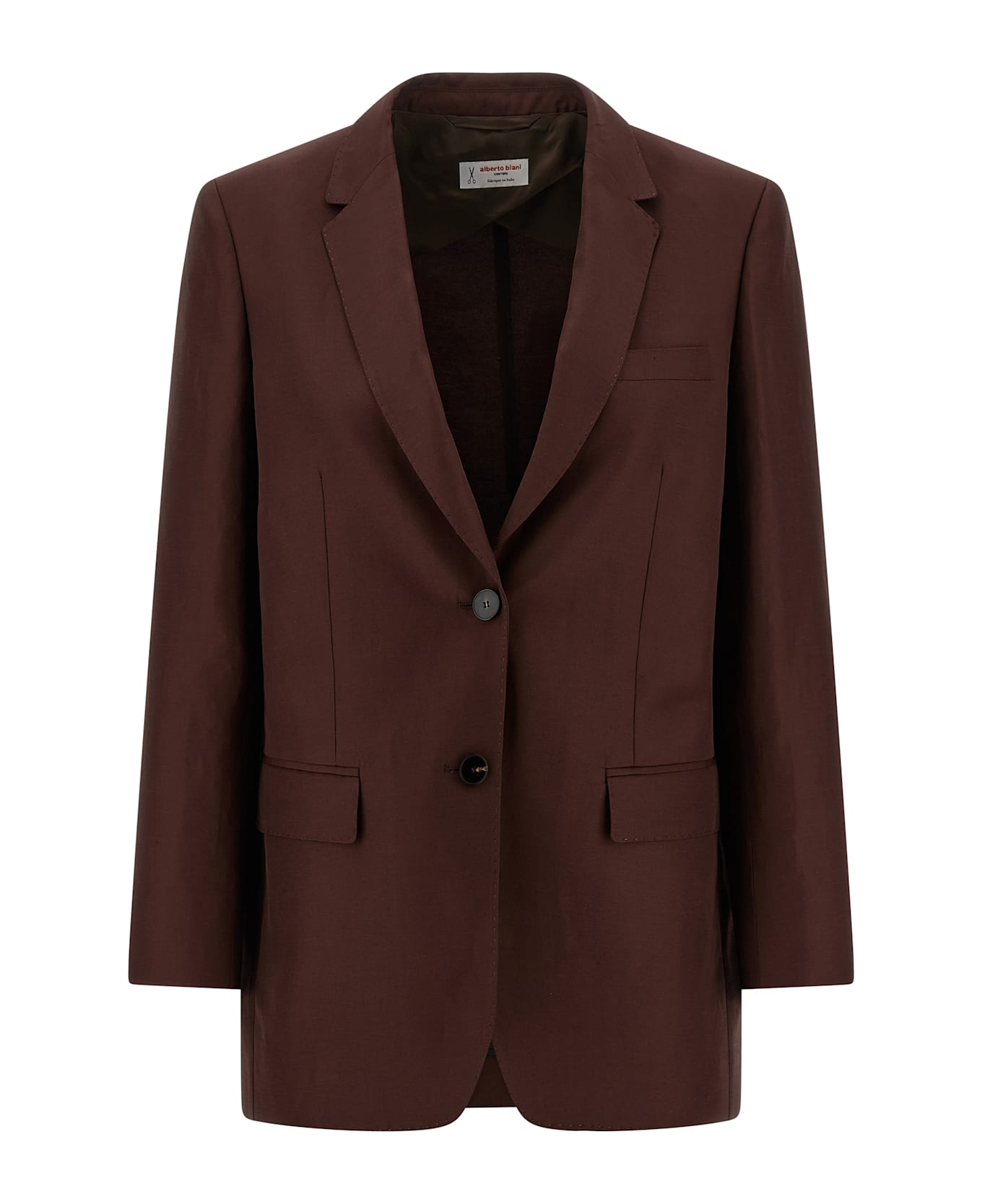 'America' single-breasted blazer in viscose and linen blend with front horn button closure, visible stitching, mirror lapels, breast pocket, flap pockets, structured shoulder strap, long sleeves, back split, unlined.