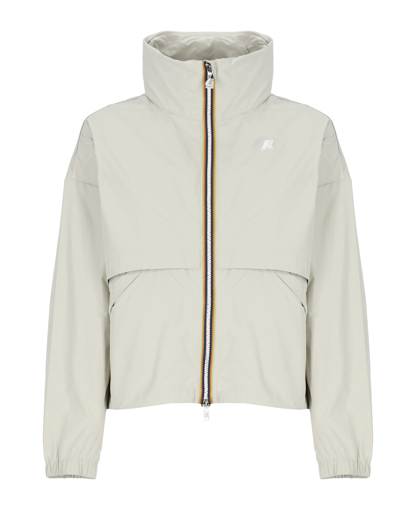 - Beige K-Way waterproof jacket for woman - High neckline - Foldable hood - Two front slit pockets - Long sleeves - Front zip fastening - Front logo