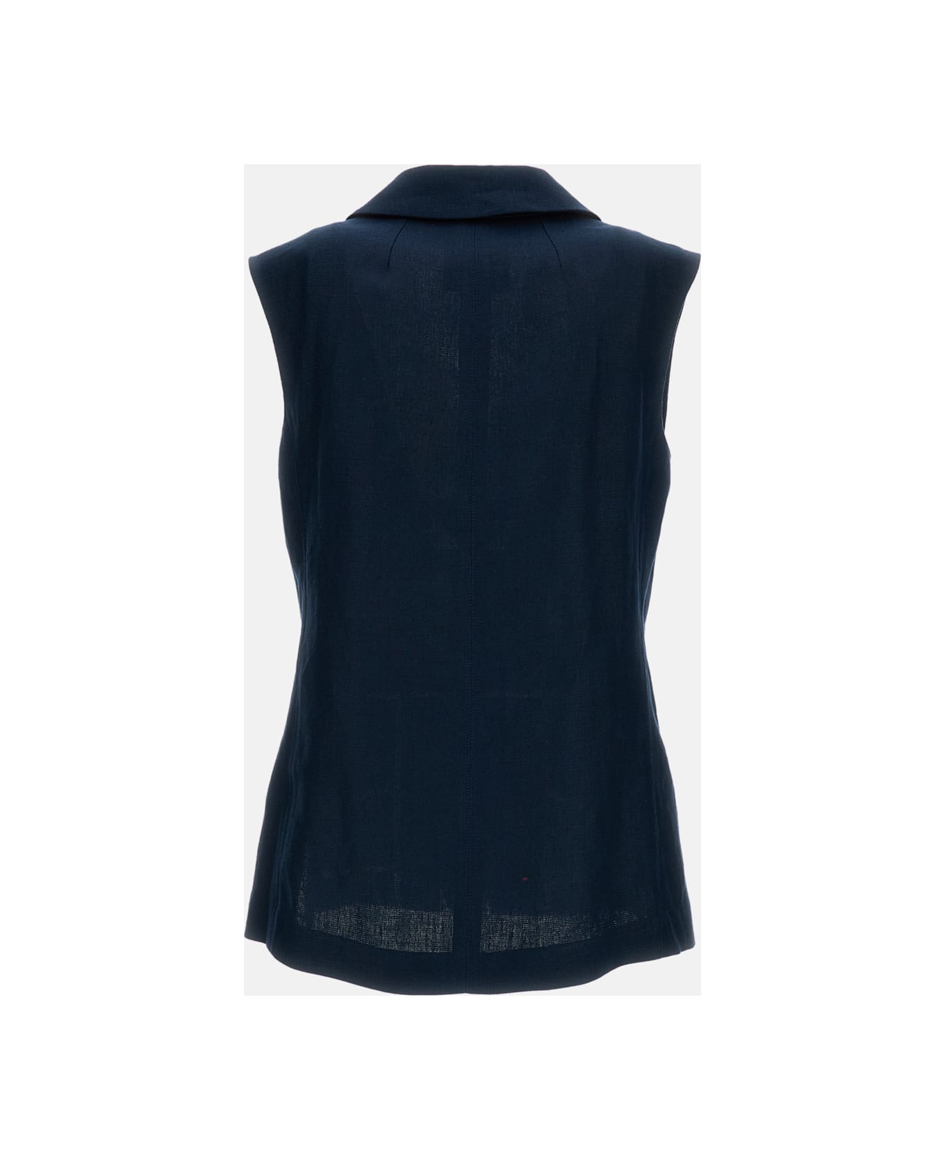 Double-breasted linen vest Straight cut Partially lined Classic notched collar Front welt pockets Side slits at the hips Color: blue Composition: 100% Linen