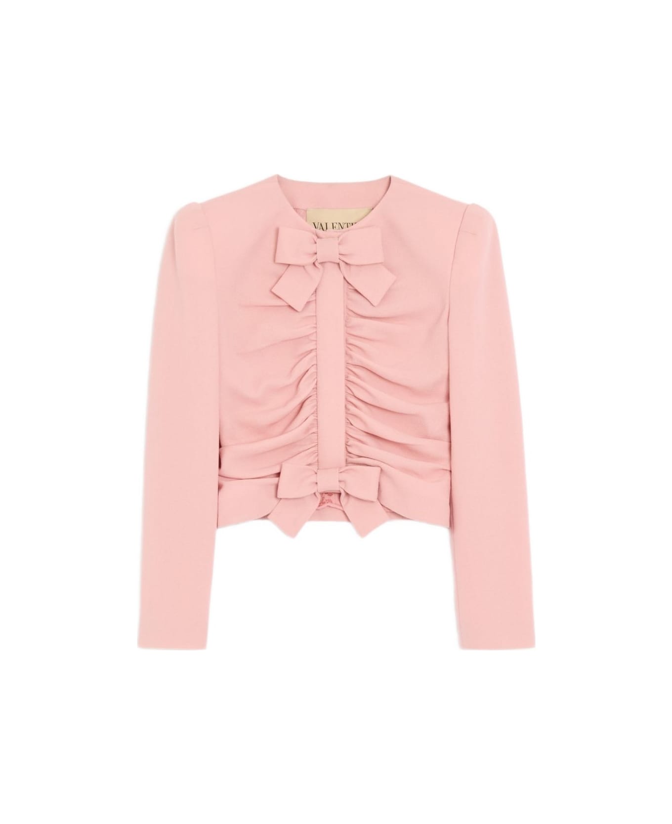 Cropped jacket with front ruching and matching bows padded shoulders front zipper closure with snap buttons flower, stripes, and VLogo lining (74% Acetate, 26% Silk) length: 48 cm / 18. 9 in. from the shoulders in an Italian size 40