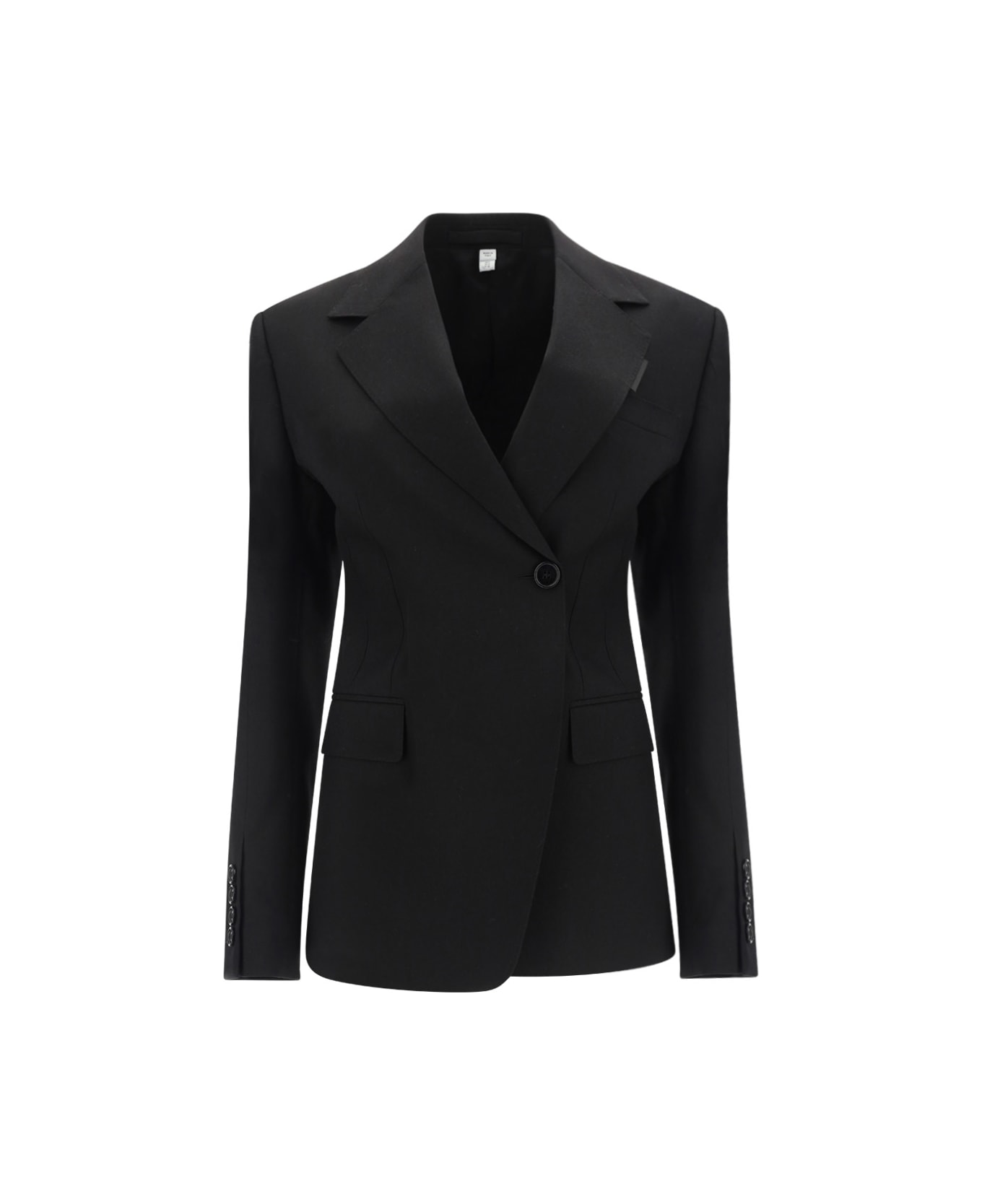Wool claudette blazer jacket by burberry, double-breasted front closure with matching button, classic lapels, two welt pockets with side flaps, one front welt pocket, back vent, structured shoulders, regular fit. Composition: 100% % Wool