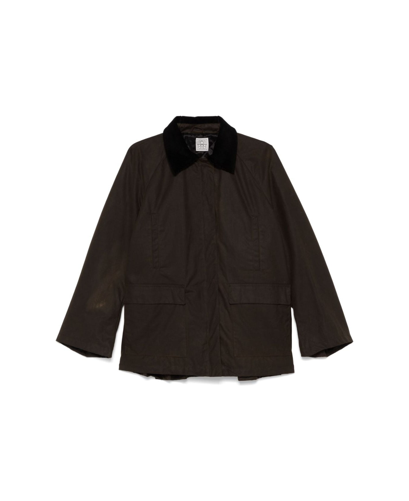 cedar brown organic cotton canvas wax coated front press-stud and zip fastening corduroy collar two chest welt pockets long raglan sleeves two front patch pockets two side slit pockets English rear vents quilted lining straight hem