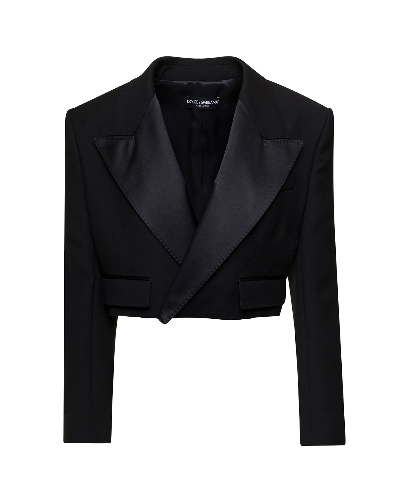 Black Cropped Jacket With Satin Revers In Wool Woman