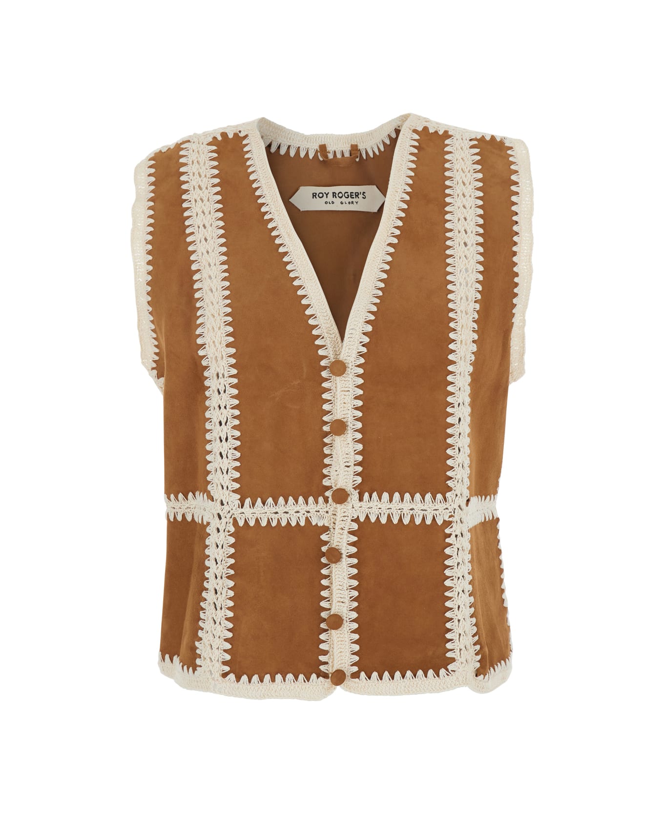 Vest with front closure and sleeveless design. Light brown color with crochet and suede details. It features a straight hem and contrasting stitching. Made of suede and crochet. Regular fit.