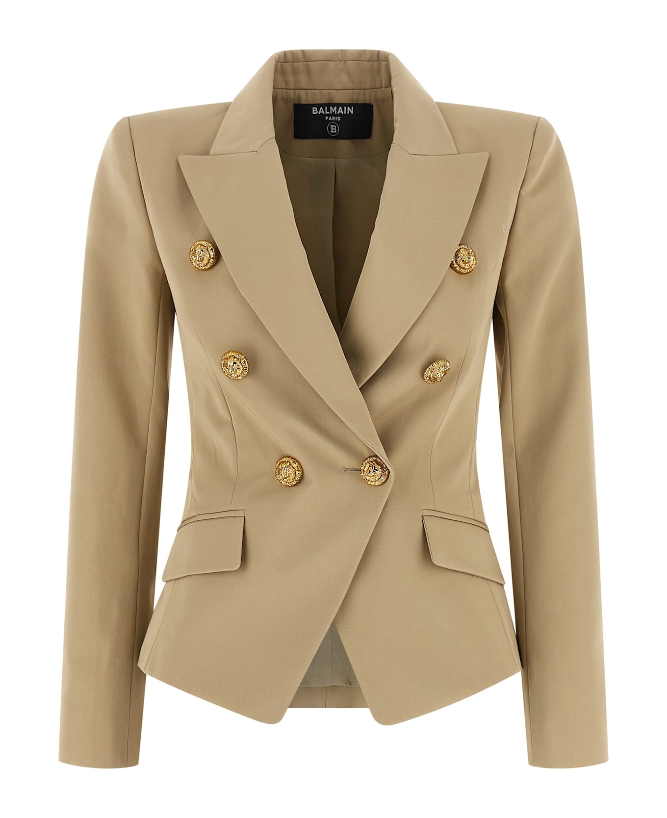 Double-breasted cotton gabardine blazer with front metal 'Testa di Leone' button closure, peak lapels, patch pockets, padded shoulders, long sleeves, and asymmetrical hem. Composition: 100% cotton