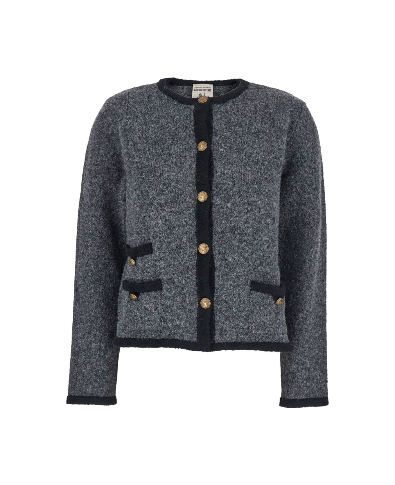 grey textured knit black trim gold-tone buttons flap pockets button fastening