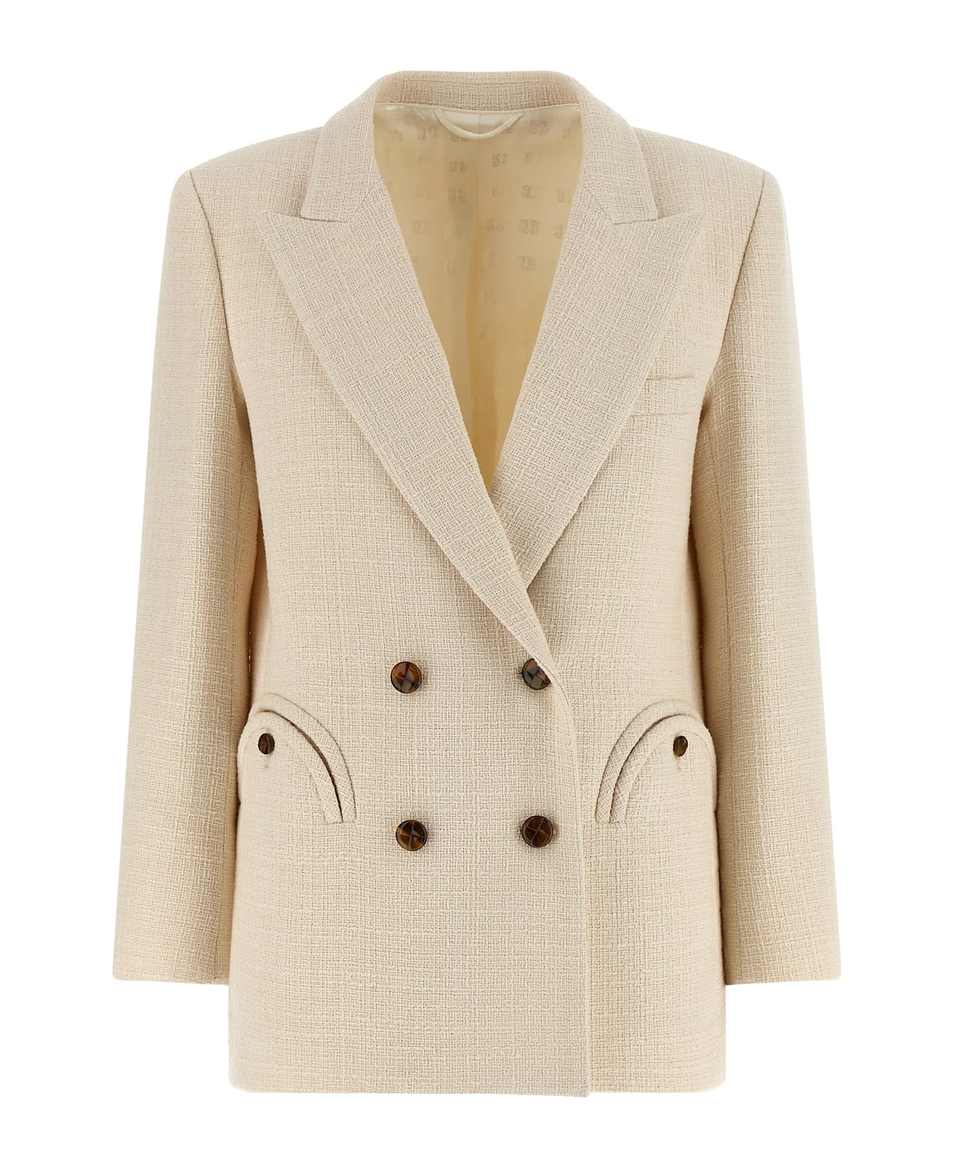 'Missy Everynight' double-breasted cotton tweed blazer with front shiny braided button closure, peak lapels, breast pocket, 'Smiley' pockets, four inner pockets, long sleeves, squared shoulder with slightly padded shoulder straps, back vents, monogram viscose lining.