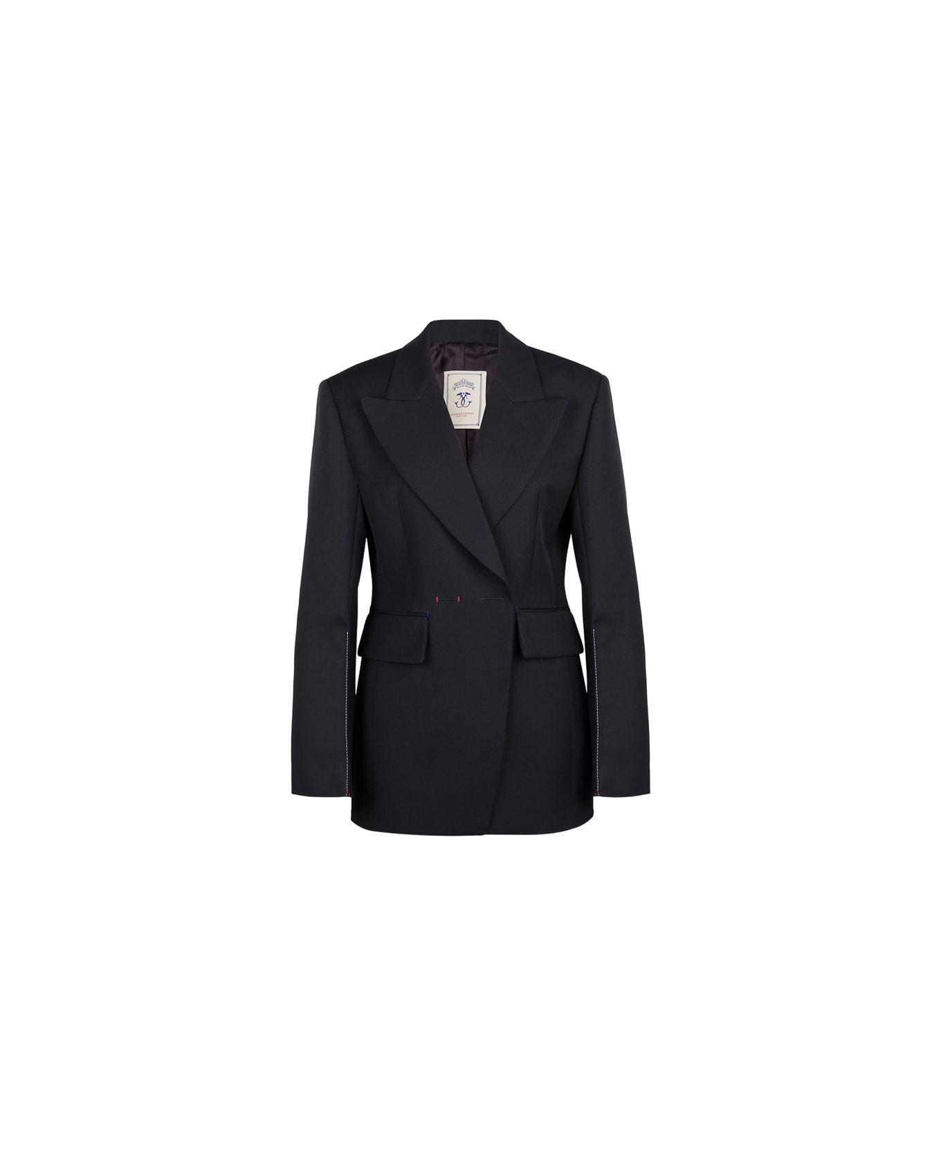 black notched lapel double-breasted button fastening long sleeves front flap pockets contrast stitching