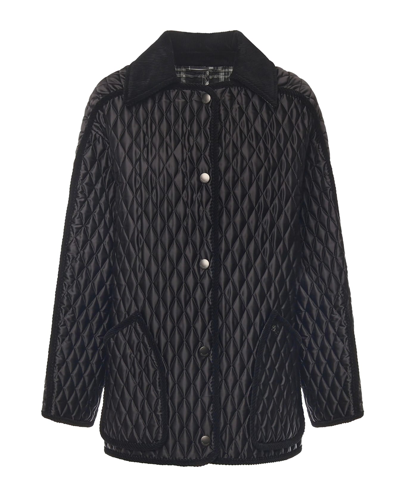 - Made of shiny nylon with corduroy trim - Front button closure - Front pockets - Relaxed fit - Made in Italy - Size shown in photo is XS - Color: Black