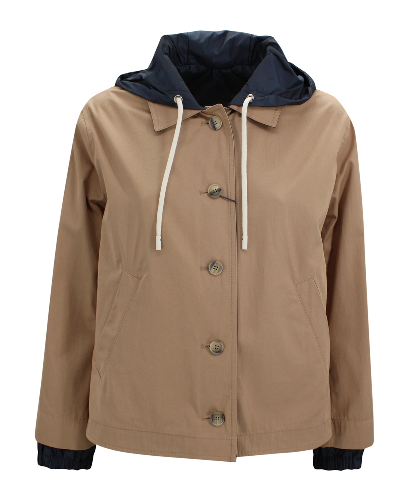 Jacket crafted in beige, featuring a reversible design for versatile styling options. The model includes button fastening, a pointed collar, hood, and an adjustable drawstring, combining practicality with a clean silhouette.