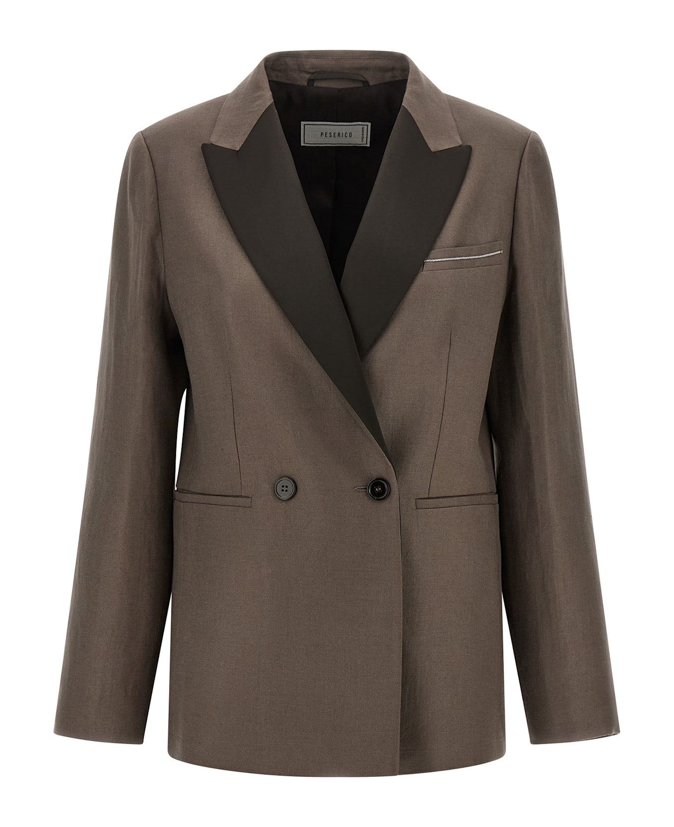 Double-breasted linen blazer with front horn button closure, tone-on-tone satin peak lapels, pocket with metal detail, patch pockets, structured shoulder strap, back vents, viscose lining. Composition: 100% linen