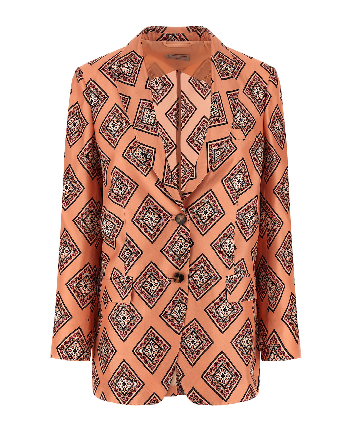 Single-breasted silk blazer with front horn button closure, mirror lapels, breast pocket, flap pockets, padded shoulder, long sleeves, back split, unlined. Composition: 100% silk
