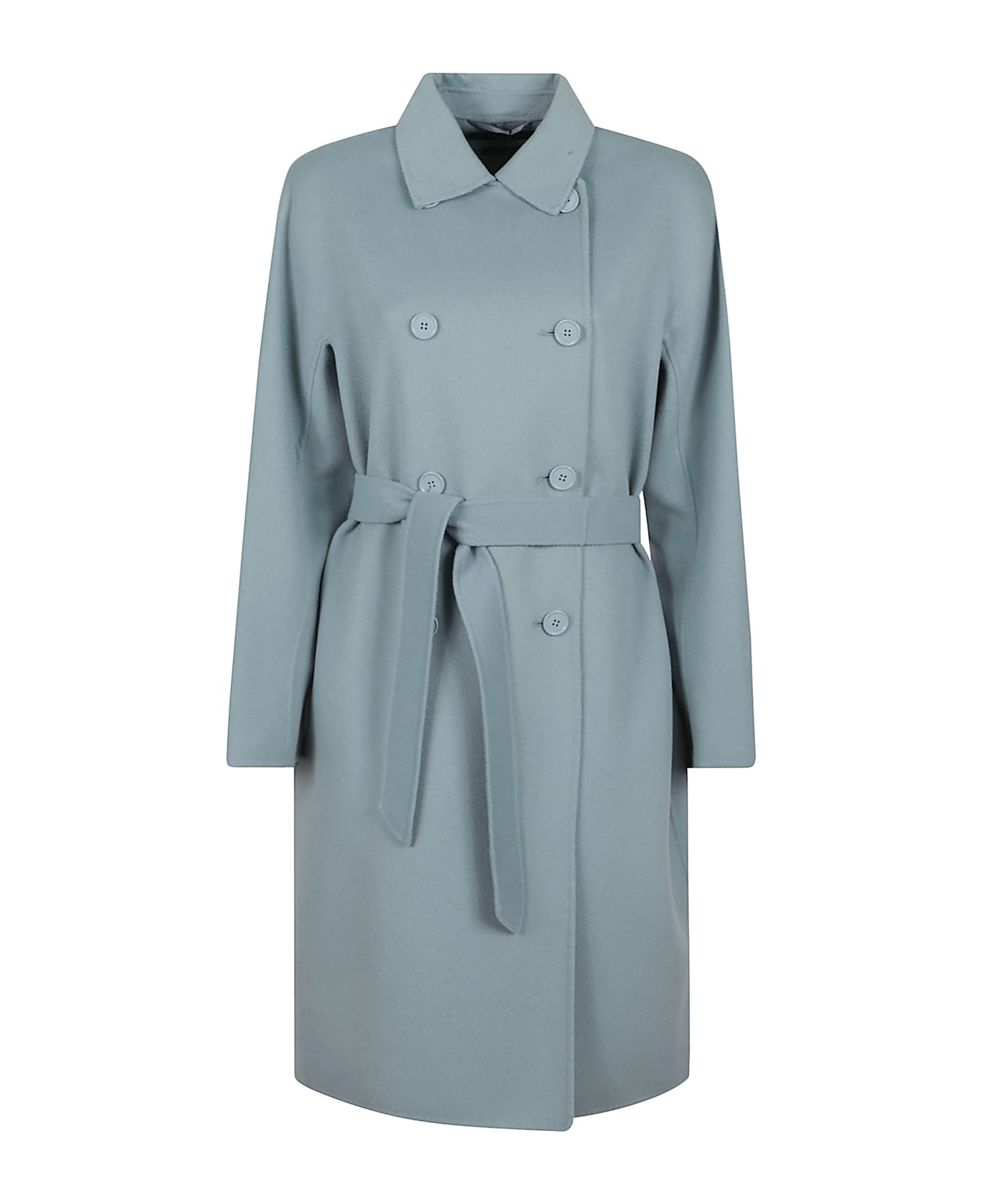 Double-breasted coat in double wool with shirt collar and belt. Above-the-knee length, comfortable fit.