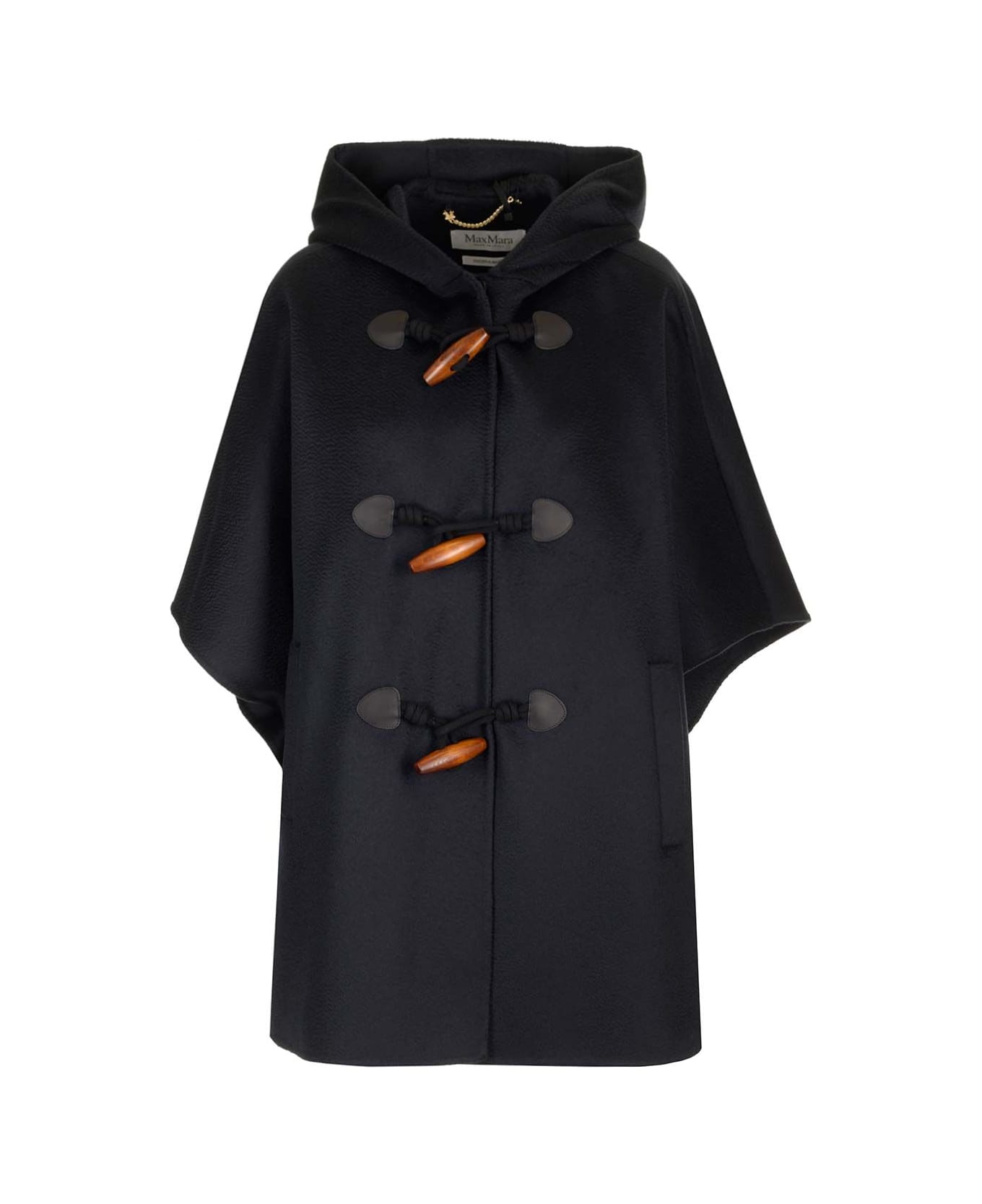 Short cape from Max Mara in fine pure cashmere double drap, with hood and short kimono sleeves, welt pockets on the sides and front closure with toggles. Composition: 100% Cashmere Capra hircus hircus CINA