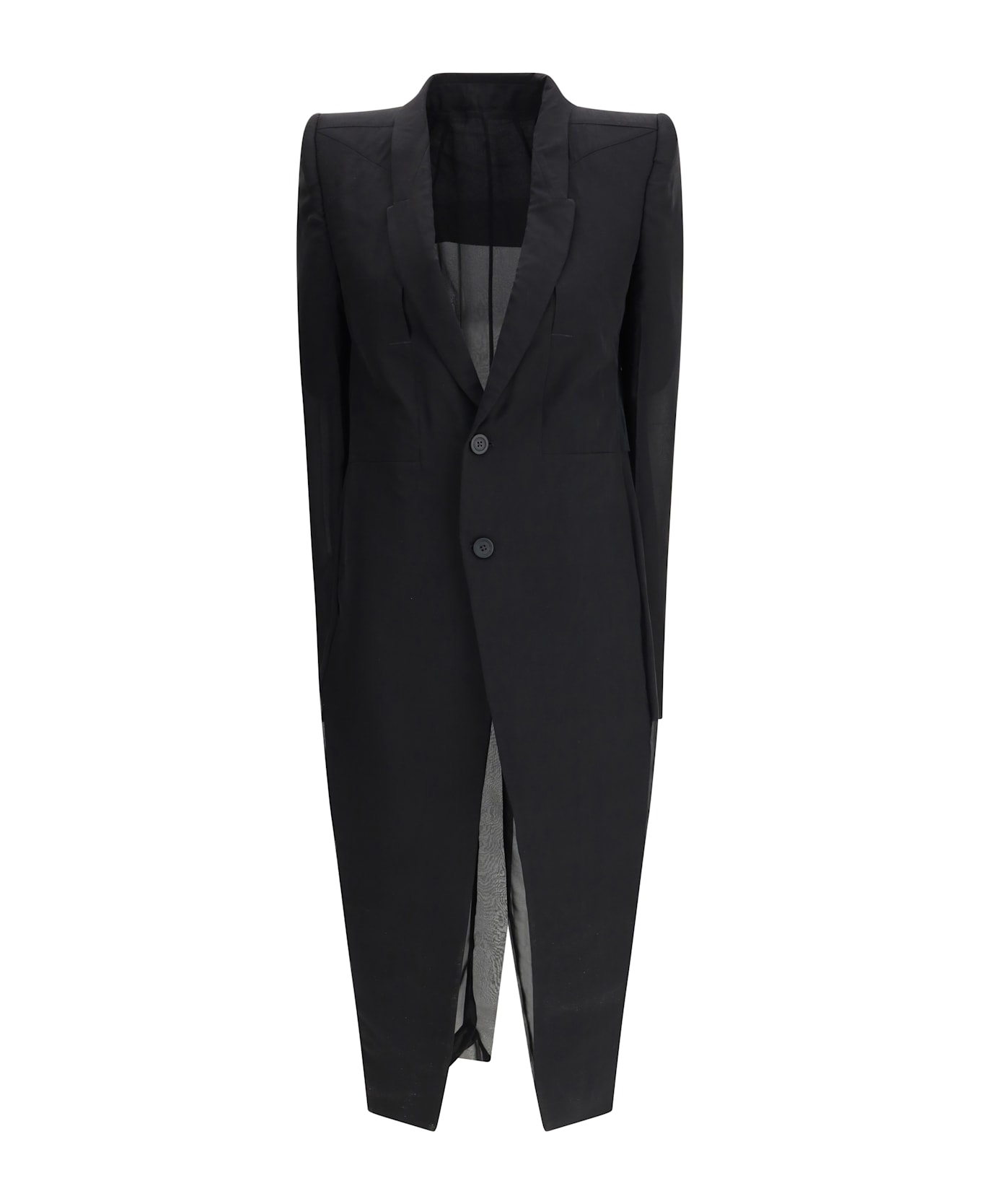 Rick owens' chiffon and tulle long coat is a statement piece that blends lightness and structure with the brand's bold aesthetic. featuring classic lapels and a front button closure, it has padded, square shoulders that define a bold silhouette. the deep back slit adds movement and theatricality, enhancing the contrast between the ethereal fabrics and architectural lines.