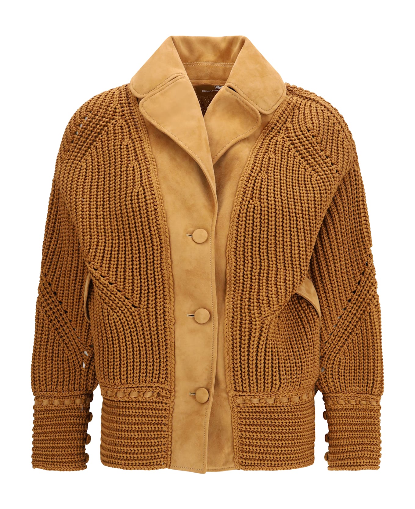 The cotton cardigan by ermanno scervino is an elegant and sophisticated garment, made from pure cotton with hand-knitted pearl stitching. the suede details decorating the lapel, button placket, pockets, and buttons add a touch of luxury to the design. the leather weaving on the hem and sleeve ends complete the look, while the slightly oversized fit gives the cardigan a modern and comfortable silhouette. perfect for a refined and contemporary outfit.
