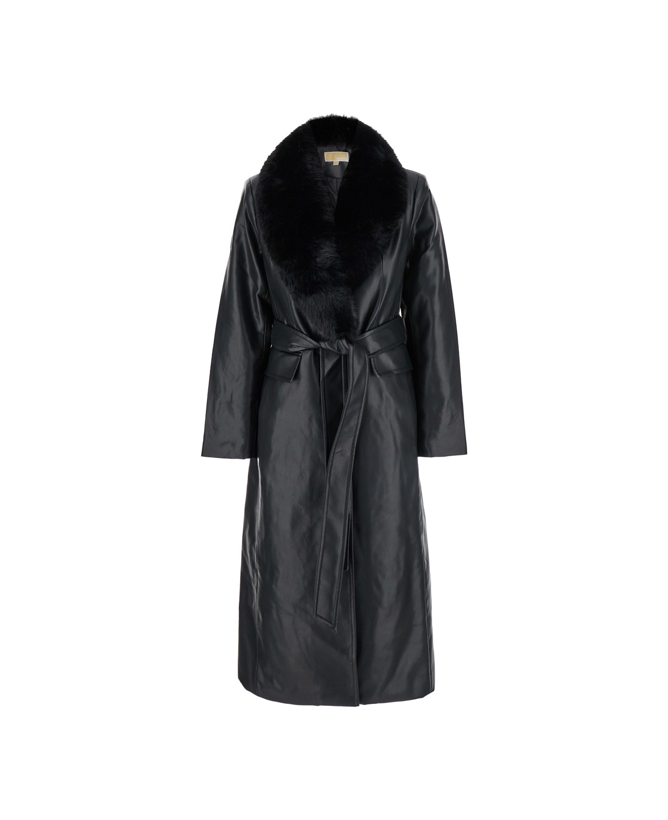 Coat Black Removable classic faux-fur lapels Long sleeves Front button closure Shoulder pads Waist belt Two side pockets Straight hem Eco-leather Regular fit