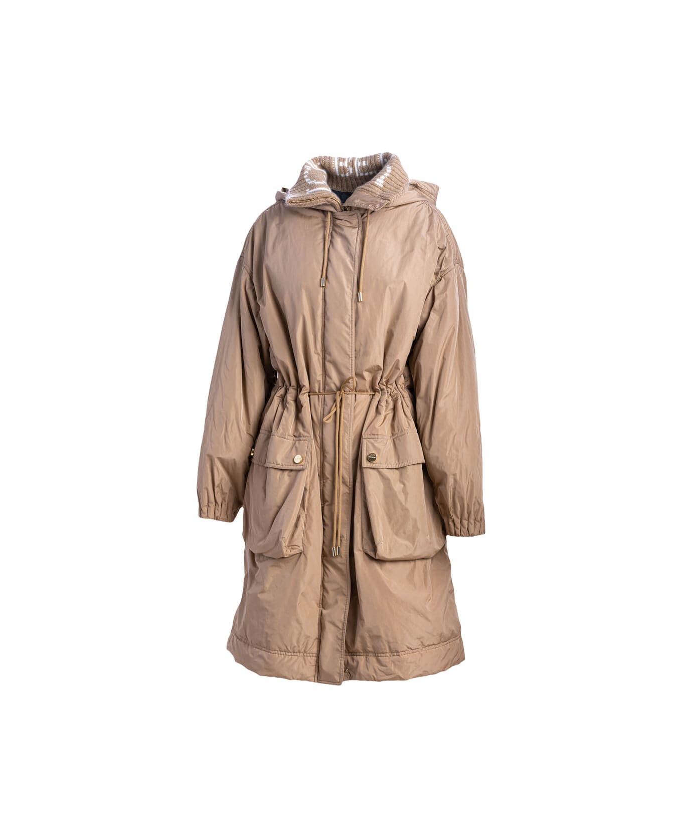 ICEBERG women's long jacket extremely feminine, comfortable, beige, warm for a casual look and harsh climates, inlaid collar with logo, zip and button fastening, adjustable hood and waist with drawstring, two front pockets with logoed buttons, slit on back, elasticated cuffs, ideal for autumn and winter, Made in Italy.