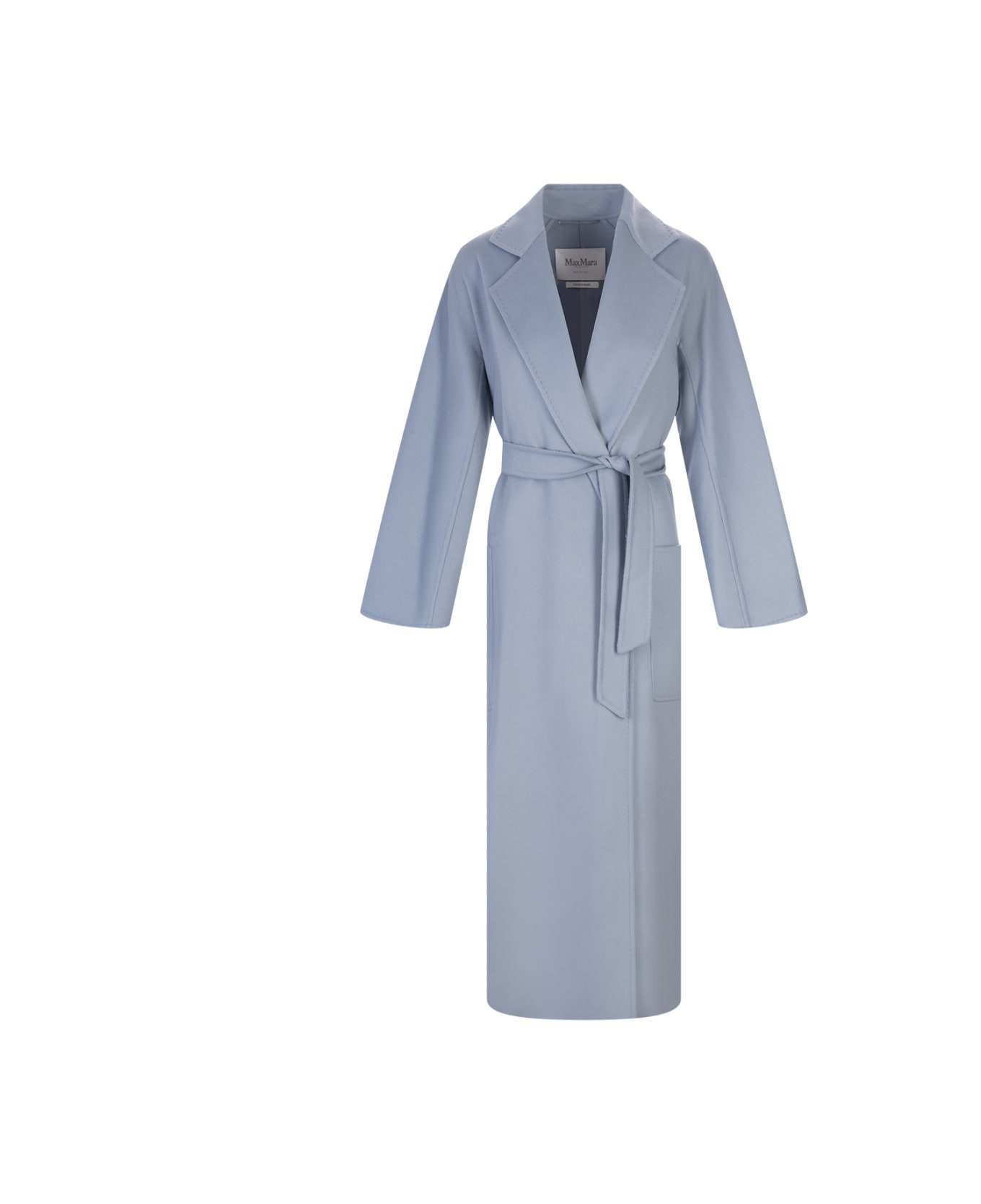 Light-blue Cadmio Long Coat By Max Mara Made Of Lightweight Wool And Cashmere Doubled And Finished With Tailored Dot. Model Featuring Lapel Collar, Patch Pockets, Kimono Sleeves In Front And Raglan Sleeves In Back. The Garment Is Distinguished By Its Loose, Wrap-around Silhouette That Hugs The Body And Can Be Customised With The Matching Belt. Length: 140 Cm.