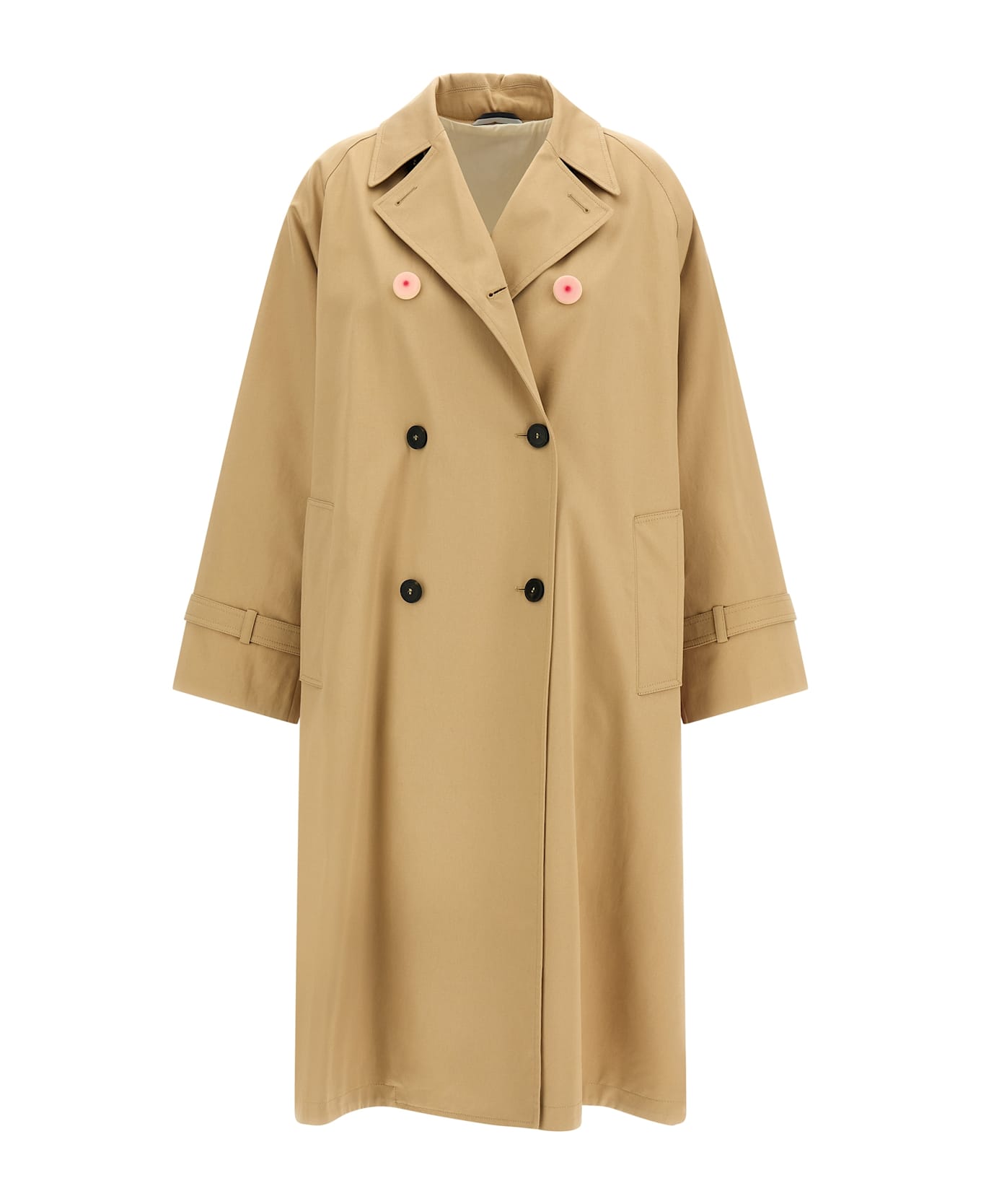 'Ninfa' capsule 'A Weekend With An Artist' trench coat designed by Shafei Xia in waterproof cotton gabardine with back print, double-breasted style with front button closure, flared silhouette, lapel collar, welt pockets, long raglan sleeves with frog on the wrist, back split, lining, removable matching belt, one pair of covers buttons included.