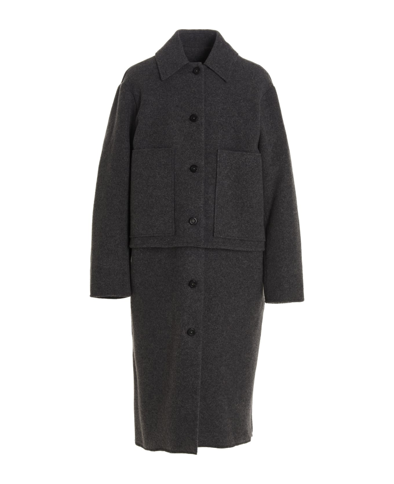 Off shoulder washed wool + inner' coat made in a cachemire blend wool, drop shoulders, long sleeves, long inner vest, button closure, in the same material, pockets and also separated useable. also usable separately.