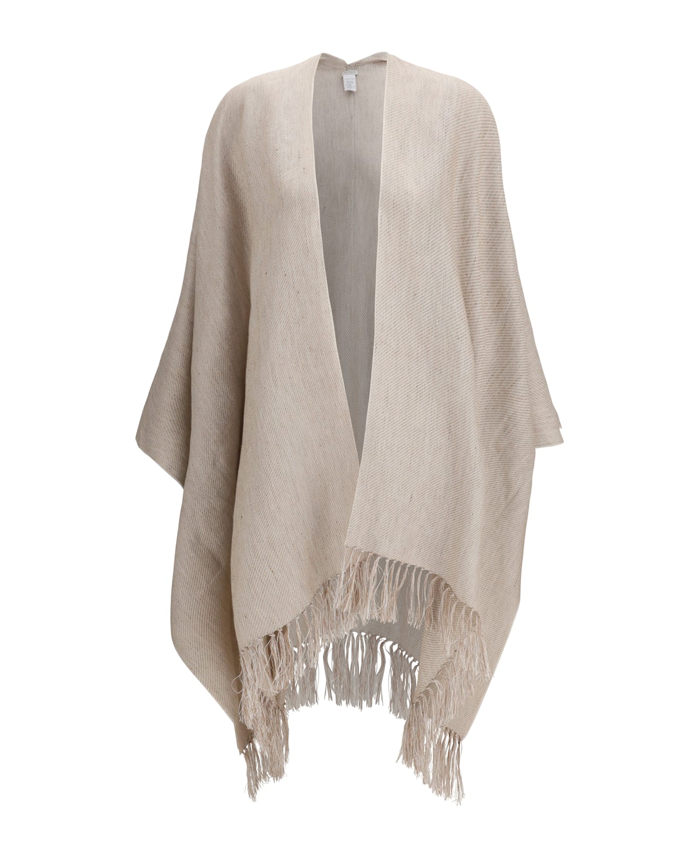 The open poncho by brunello cucinelli is an elegant and sophisticated garment, made of linen for a fresh and lightweight feel. the fabric, enriched with metallic thread, adds a touch of subtle shine and a unique visual effect. the fringes on the sides add movement, while the open design allows it to be worn with versatility, over a casual or elegant outfit. perfect for milder seasons, this poncho represents the perfect combination of comfort and luxury, typical of brunello cucinelli's refined style.