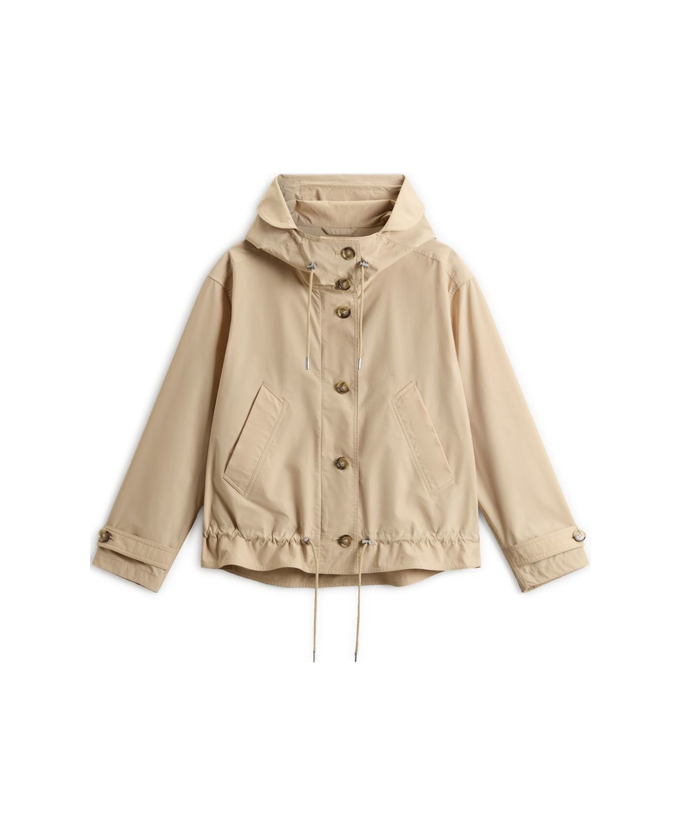 light beige front button fastening drawstring hood two side slit pockets drawstring waist