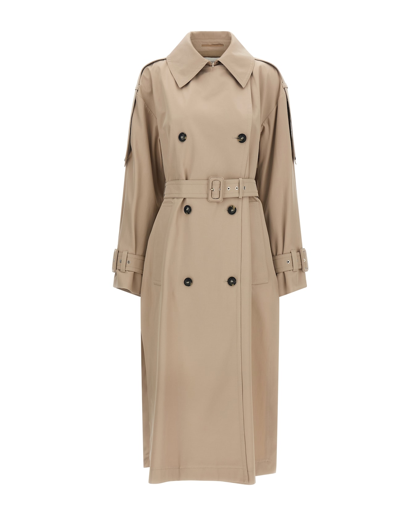 'SpxGocce' long trench coat in waterproof fabric twill, double-breasted style with front horn button closure, lapel collar, pockets, wide side slits, long sleeves with badges on shoulders and cuffs, removable gusset and chain belt at the back, removable matching belt.