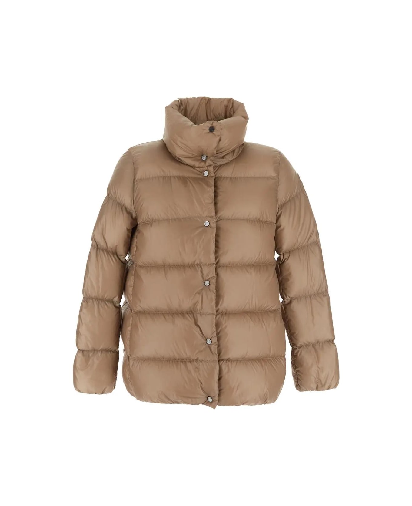 Moncler down jacket in beige polyamide with long sleeves. The item is featured by button closure, logo patch on shoulder and side zipped pockets.