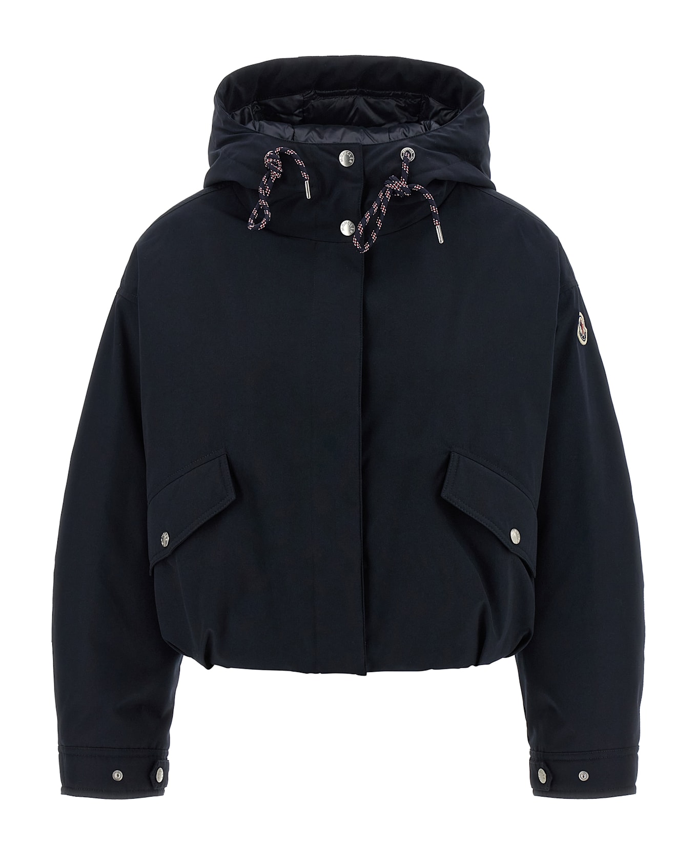 'Eucalyptus' short down jacket in cotton and polyester blend, quilted and slightly quilted goose feather long saison ue lining, cropped style, adjustable hood, high neck, zip and snap button closure, pockets, long cuffed sleeves, dropped shoulders and felt logo patch, drawstring on the hem.