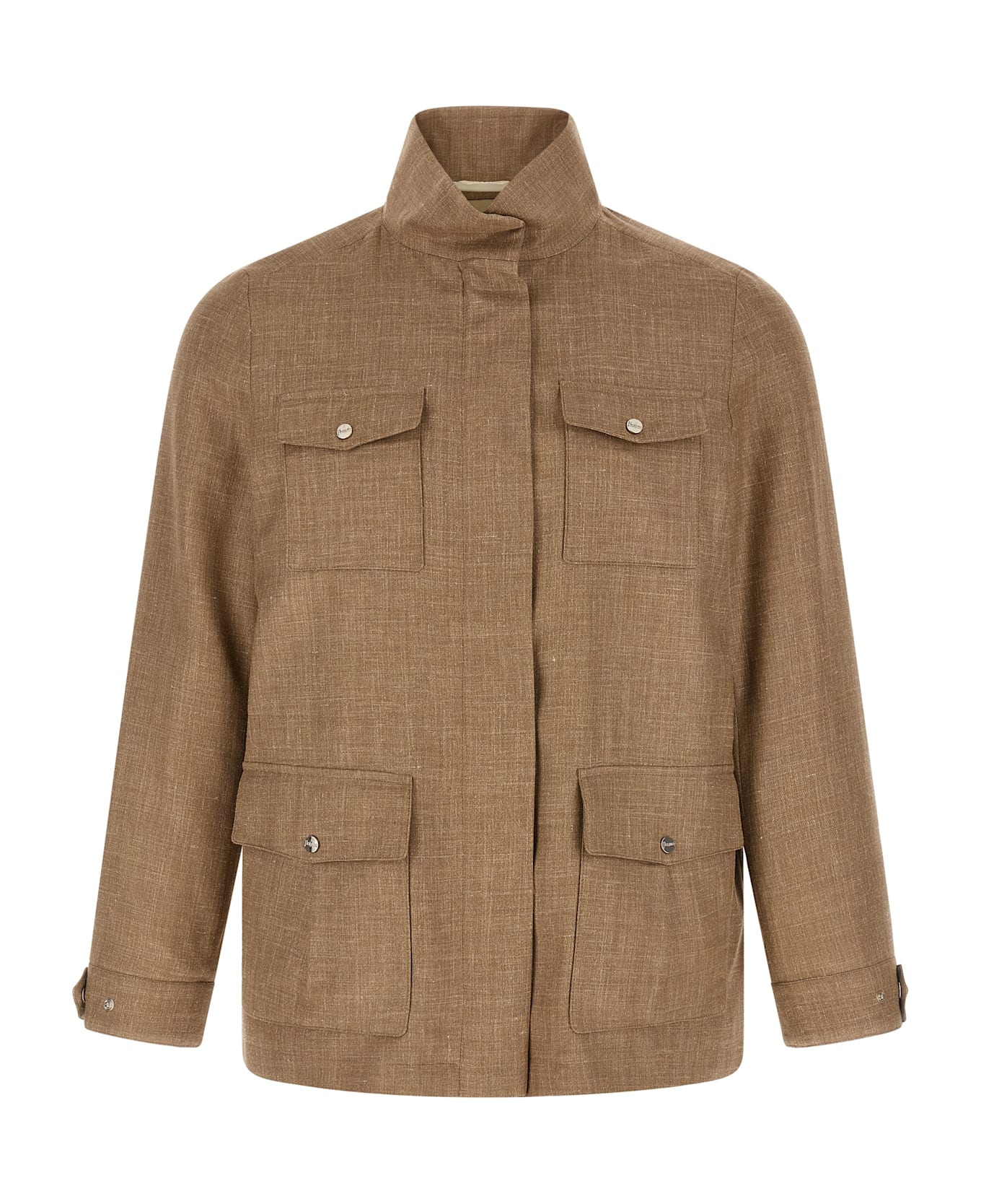 'Field' wool, silk and linen blend jacket woven with lamé thread and subjected to water repellent treatment, Saharan model, high neck, zip and snap button closure on the front, pockets, drawstring at the waist, long cuffed sleeves, lining.