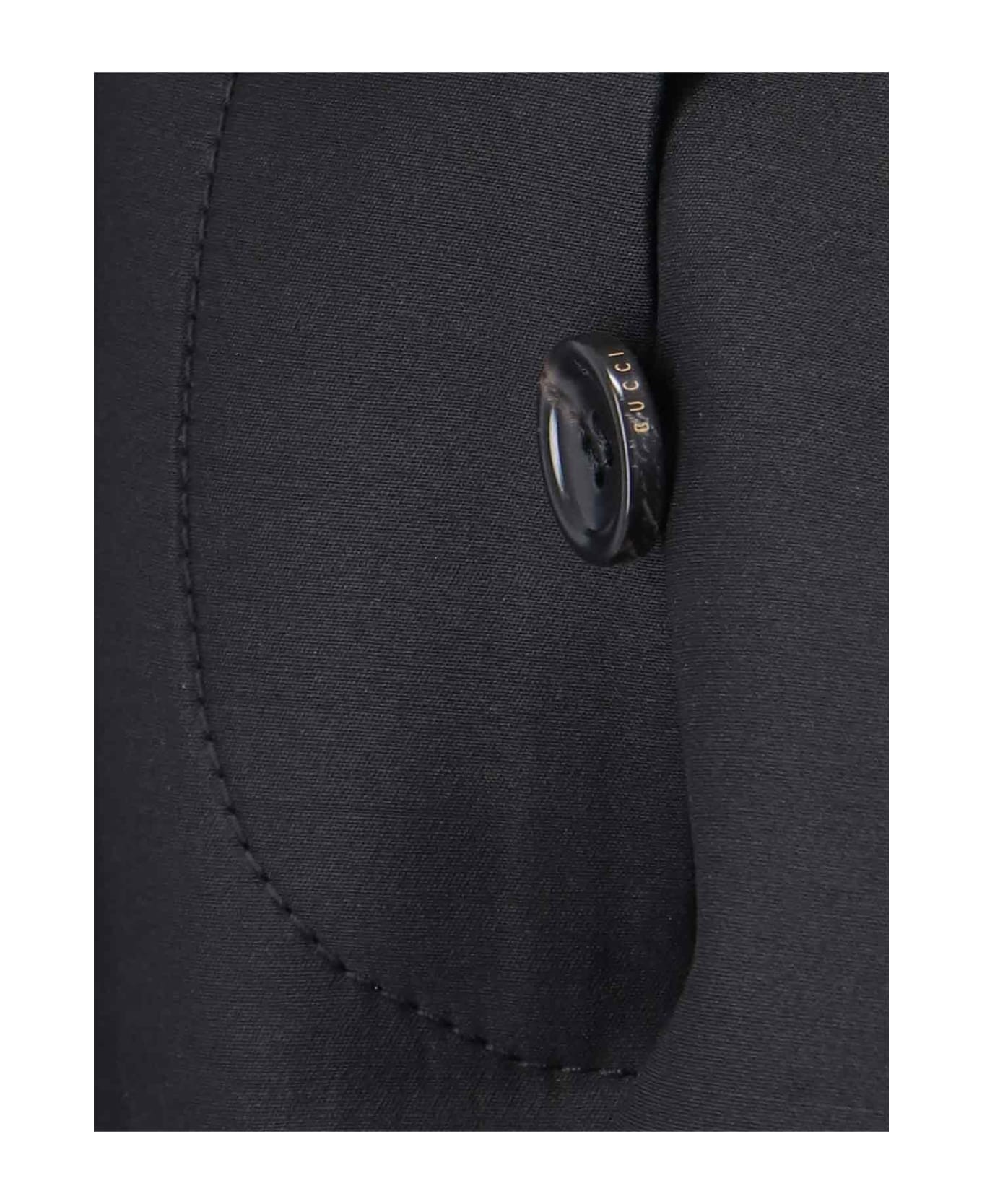 Gucci belt detail jacket, black wool and silk, high collar, two welt chest pockets, button closure, removable adjustable gold buckle belt, two front maxi pockets, center back vent, cuffs lapel detail, straight hem.