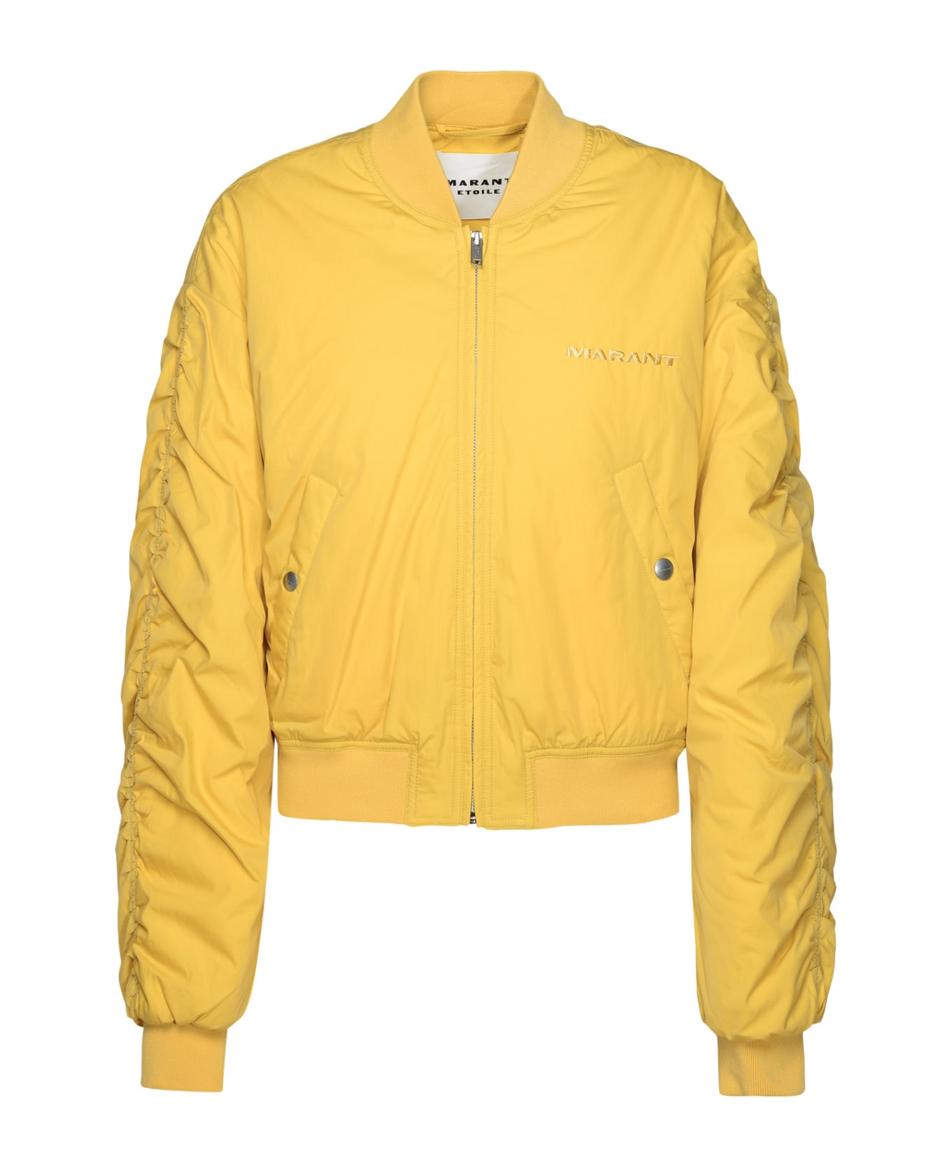 Standard fit, ribbed knit collar, front zip closure, tonal logo embroidery on the chest, slanted pockets with snap button, wide crinkled sleeves, back curled detail and ribbed knit trimming.