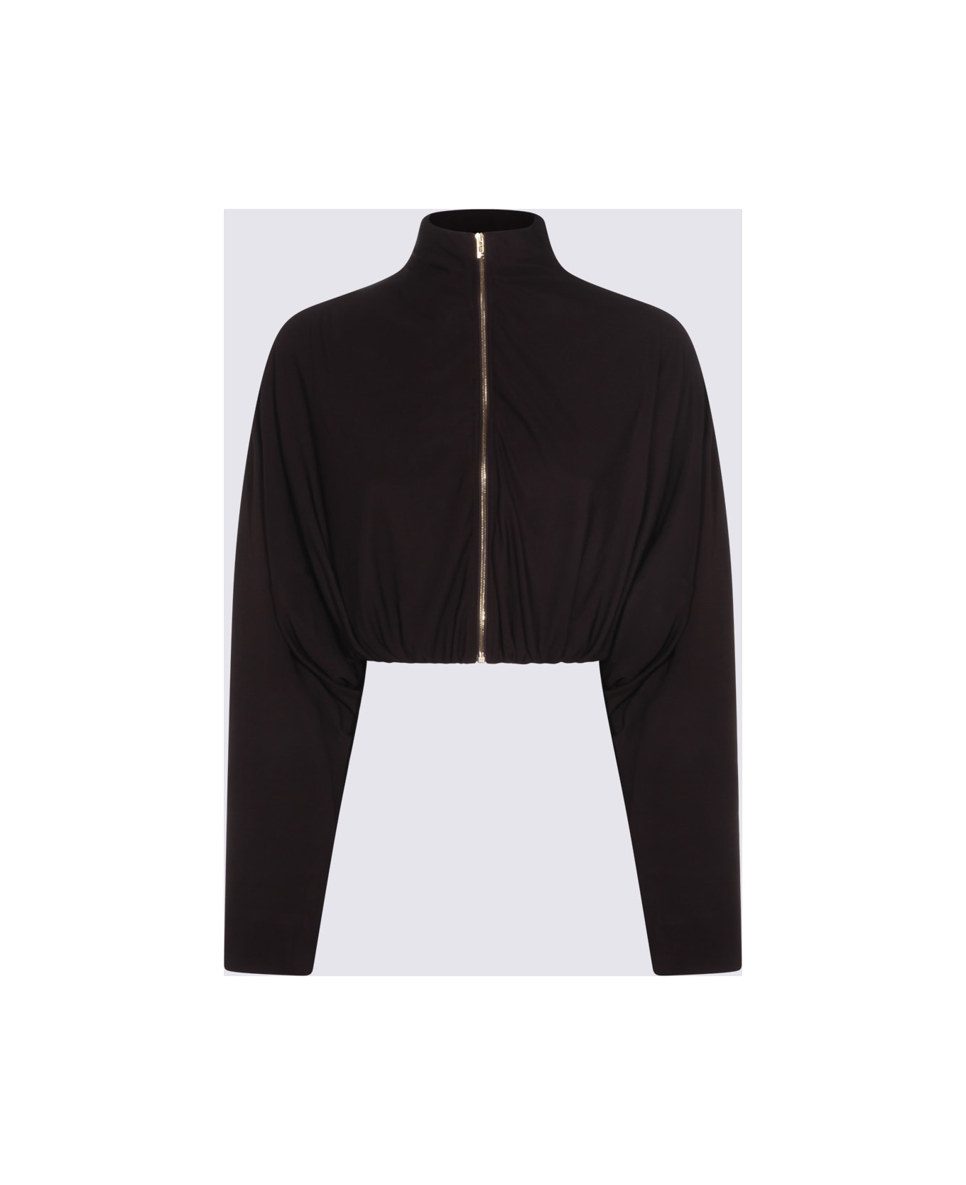Black viscose casual jacket from Alaia featuring high collar, double-layer construction, long sleeves, zipped closure, draped featuring, cropped length and regular fit. Composition: _, 81% Viscose, 19% Polyamide