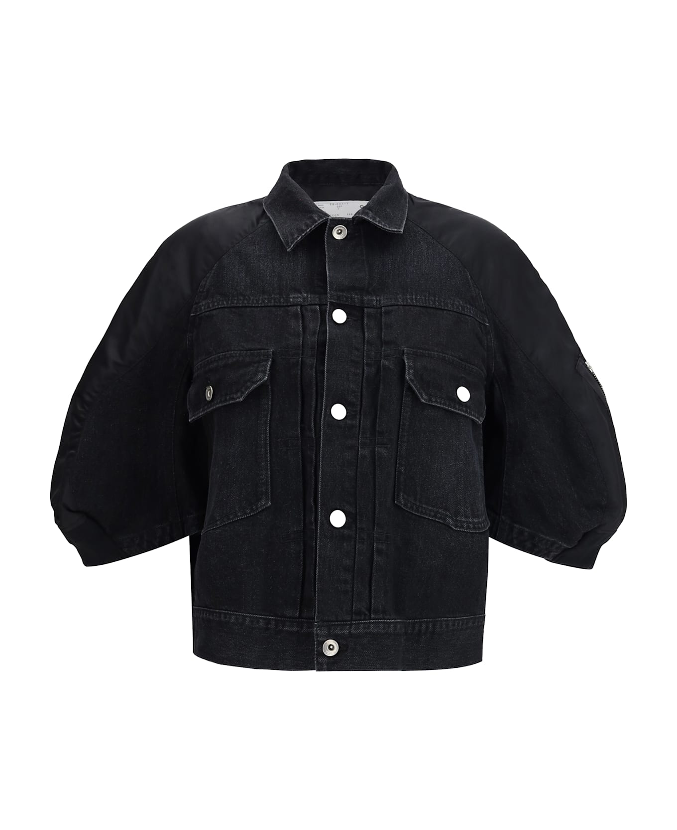 The denim x nylon twill jacket by sacai blends casual references with technical research in a contemporary design. featuring a denim body, the jacket is enhanced by contrasting sleeves that create a distinctive material interplay. dual front pockets emphasize its functional character, while ribbed cuffs and a button-front closure complete the construction with a balance of practicality and sacai s signature experimental approach.