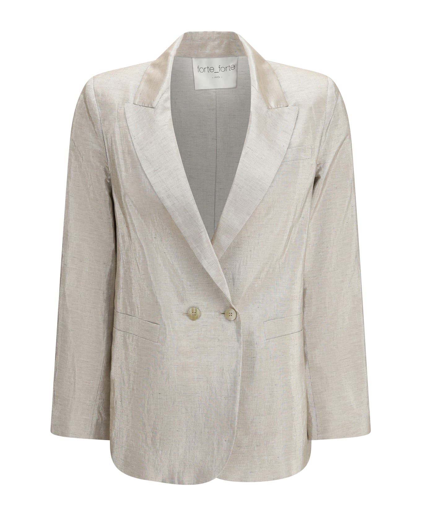The double-breasted jacket in linen and lurex with jewel buttons by forte-forte blends tailored formality with a luminous and feminine spirit. soft lines around the bust enhance the silhouette with natural harmony, while the textured shimmering fabric adds depth and character. subtle darts shape the figure with precision, completing an elegant blazer designed for refined and contemporary outfits.