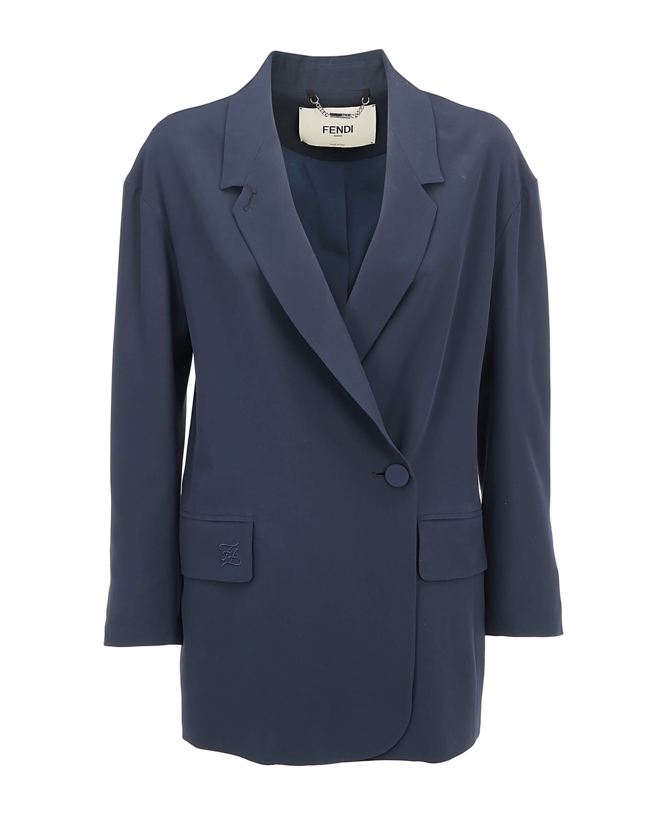 Navy Blue Silk Jacket by Fendi, wrap closure with button on front, two flap welt pockets, buttoned cuffs, embroided logo on front pocket.