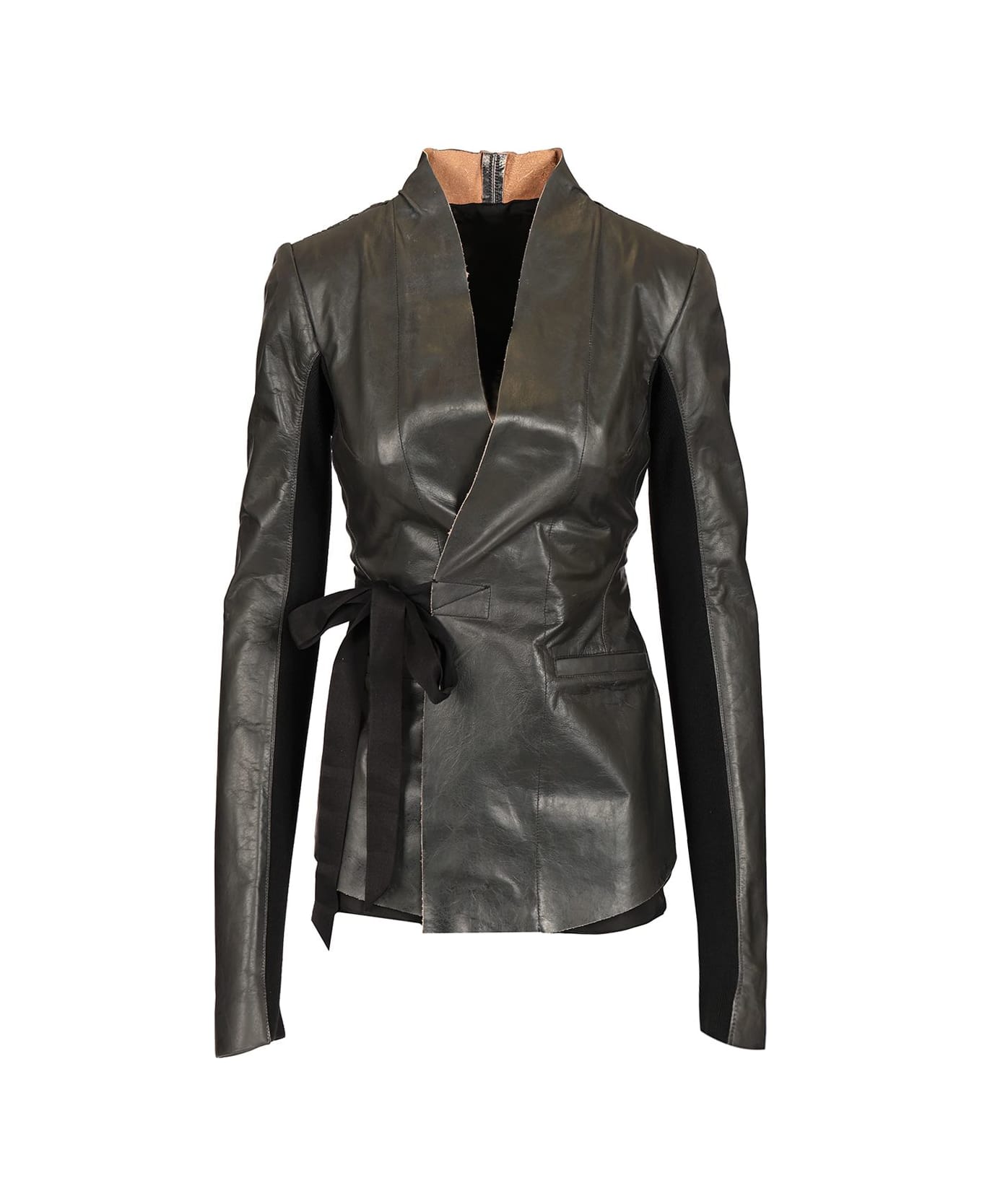 "Hollywood" jacket from Rick Owens made with calf leather and finished with raw cut, double-breasted closure with ribbon to tie on the side, long sleeves, fitted design.