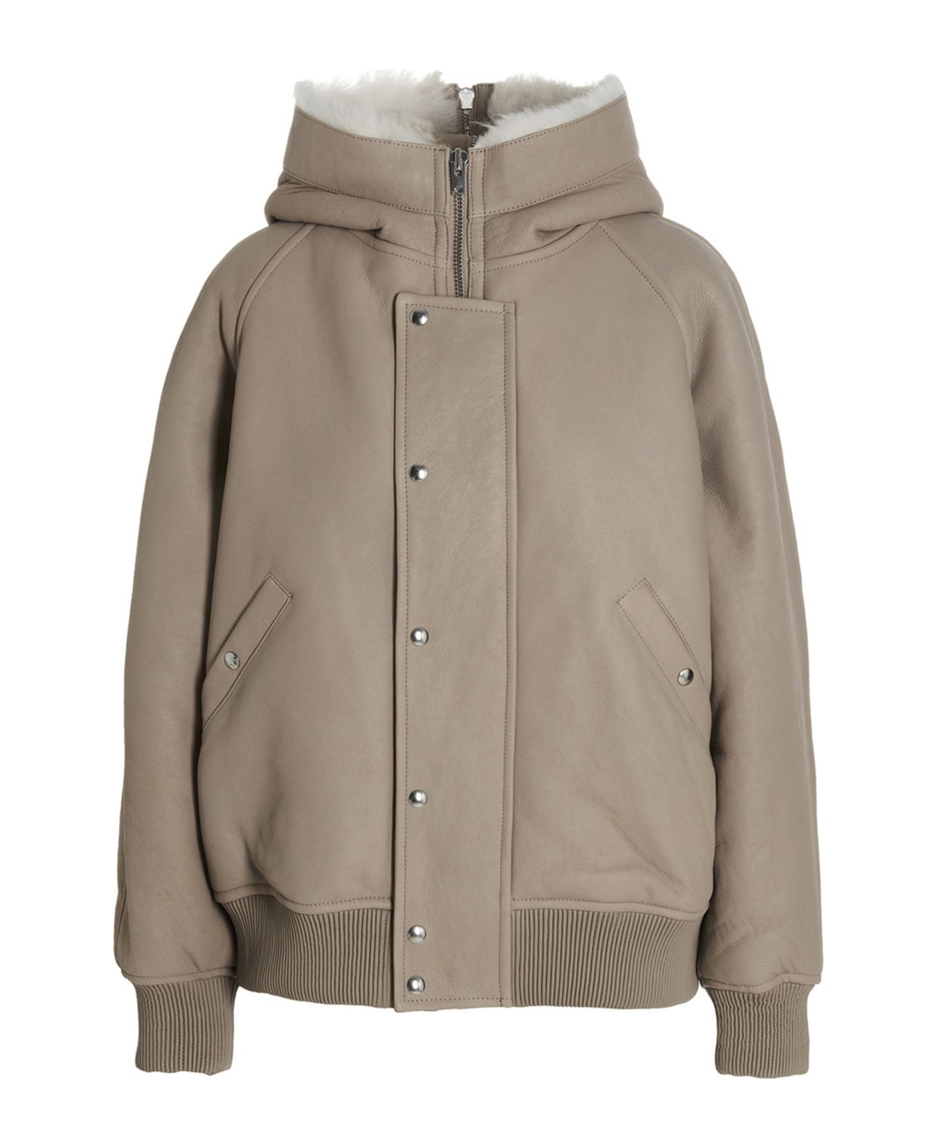 Inesh' leather bomber jacket with shearling lining, hood, zip and button closure, pockets and long cuffed sleeves.