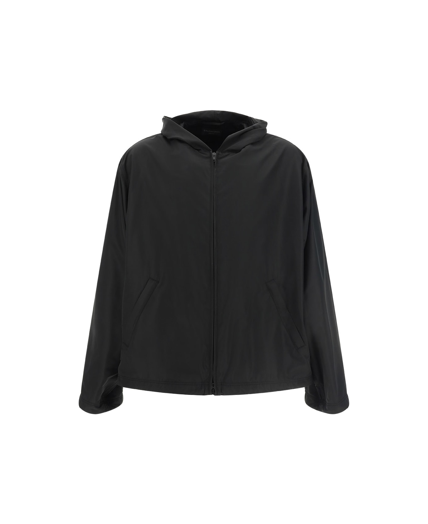 Jacket by balenciaga, front zipper closure, hooded design, two side welt pockets, iconic brand monogram printed in contrast on back, regular fit. Composition: 53% % Polyester, 47% % Viscose