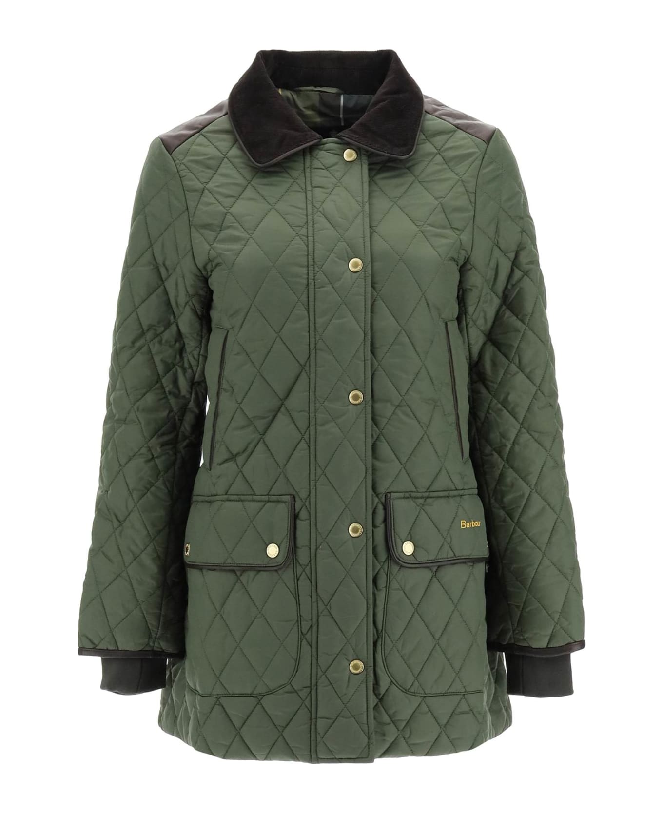 Barbour nylon jacket with classic diamond quilting, featuring courduroy pointed collar, concealed zip fastening with press buttons, ribbed knit cuffs and side slits enclosed with snaps. Finished with leather trimmings and shoulder inserts, and provided with side flap pockets, one of which decorated with a logo embroidery, and handwarmer pockets. Tartan nylon lining with one inner pocket, and slight polyester padding. The model is 177 cm tall and wears a size UK 8.