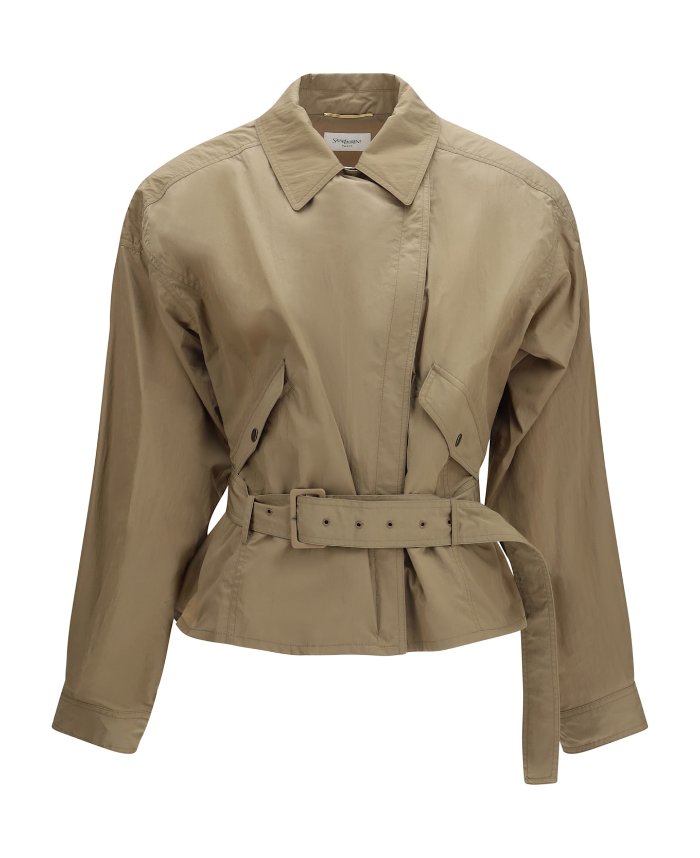 The short belted jacket by saint laurent is a piece with a strong, contemporary style, perfect for completing urban and elegant looks. the classic collar and zip closure give the model a clean, modern aesthetic, while the adjustable waist belt defines the silhouette and enhances the figure. the two front welt pockets with flap and snap button add functionality and a distinctive tailored detail.