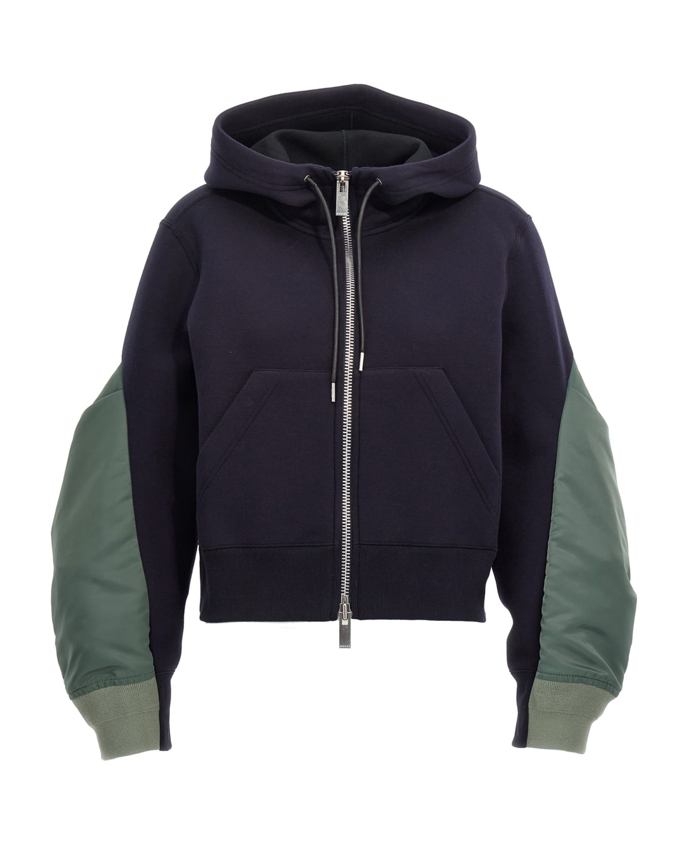 'Sponge' cotton blend hoodie with nylon inserts, pockets, zip closure, long cuffed sleeves.