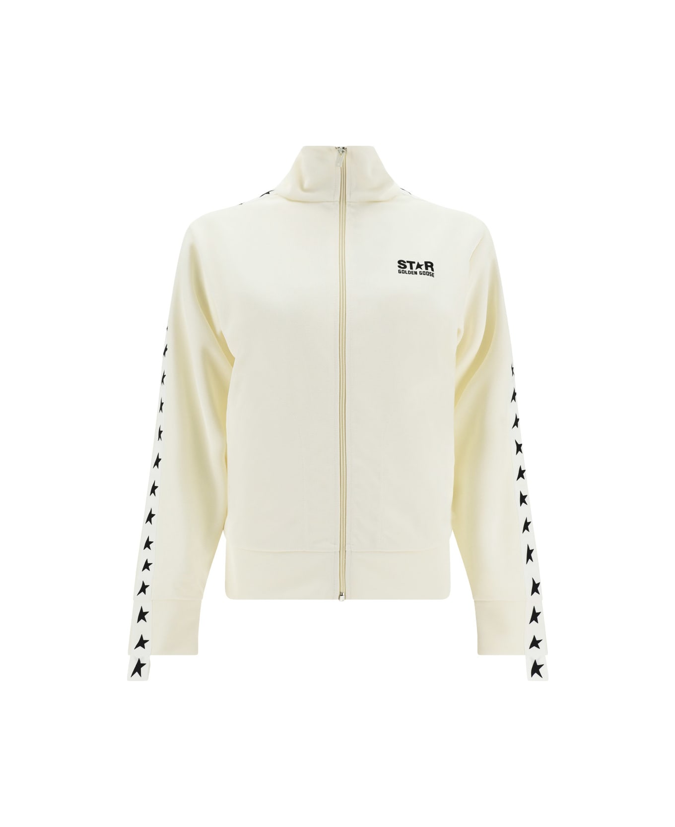 Star densie track jacket by golden goose, high collar, ribbed cuffs, ribbed hem, front zipper closure, contrasting chest print, two welt pockets on front, star bands on arms, iconic contrasting brand logo on front.