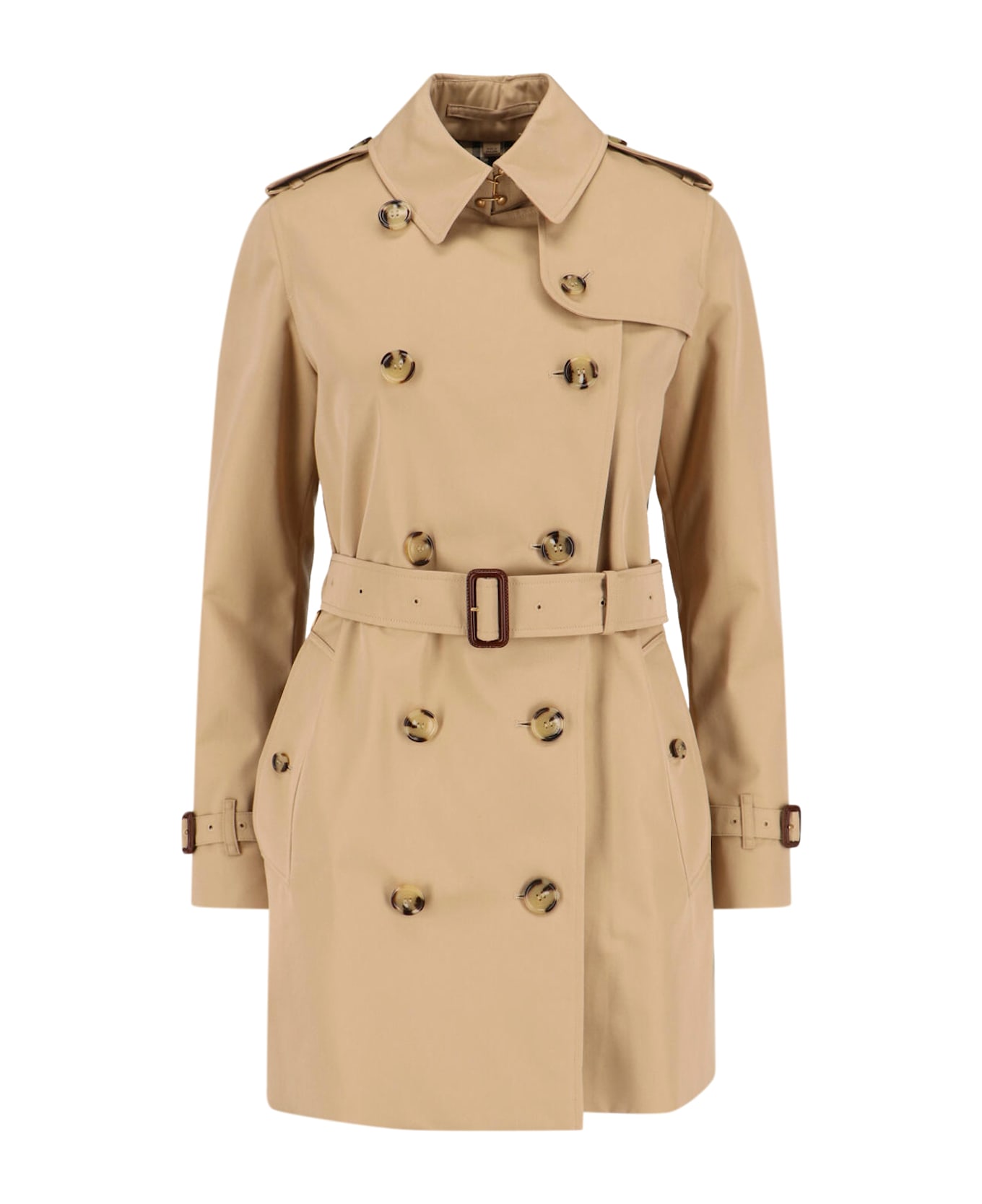 Burberry 'Kensington' double-breasted trench coat in beige cotton gabardine with collar, long sleeves, double-breasted front closure, adjustable belt at the waist, two side button pockets, straight hem. Composition: 100% Cotton