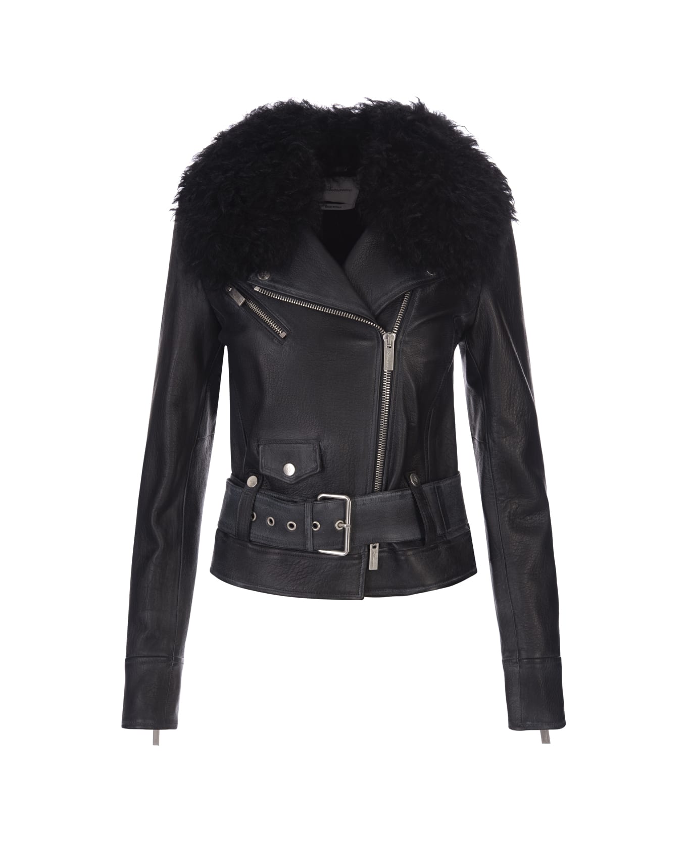 Blumarine biker jacket made of black semi-glossy nappa leather with belt loops, belt belt with buckle, tone-on-tone lining, long sleeves, asymmetrical zip fastening, removable collar in tone-on-tone Kaglan and one breast pocket with flap and snap button. Regular fit.