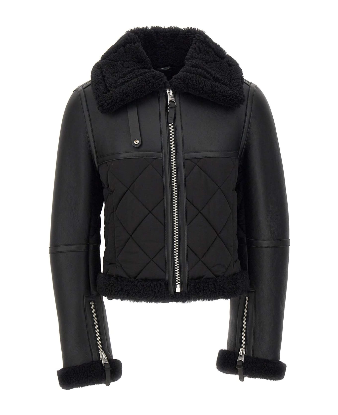 Mackage "Tulip" women's jacket extra soft sheepskin, black color, diamond quilting, wide tone-on-tone shearling collar, leather ribbon details and painted finishes on edges,zipped sleeve vents, side welt pockets, straight cut, protection from cold down to -20°C, regular fit that allows comfort and style. Dry clean using oil-based solvents only.