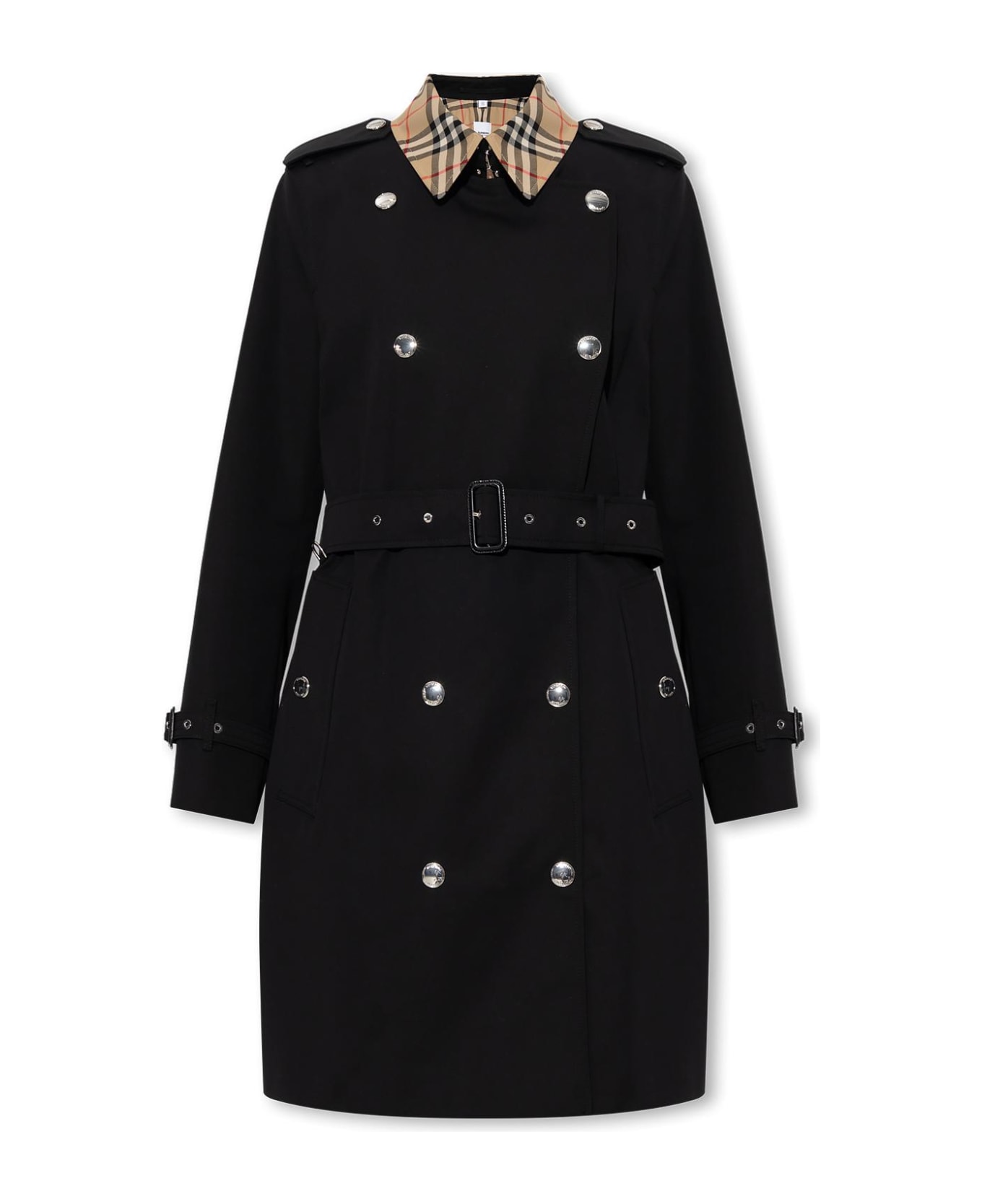 Black 'Montrose' trench coat from Burberry. Crafted from cotton with a double-breasted silhouette, this style features a waist-cinching buckle belt, snap closures, shoulder epaulettes, two front pockets with snaps, long sleeves, silver-tone metal hardware