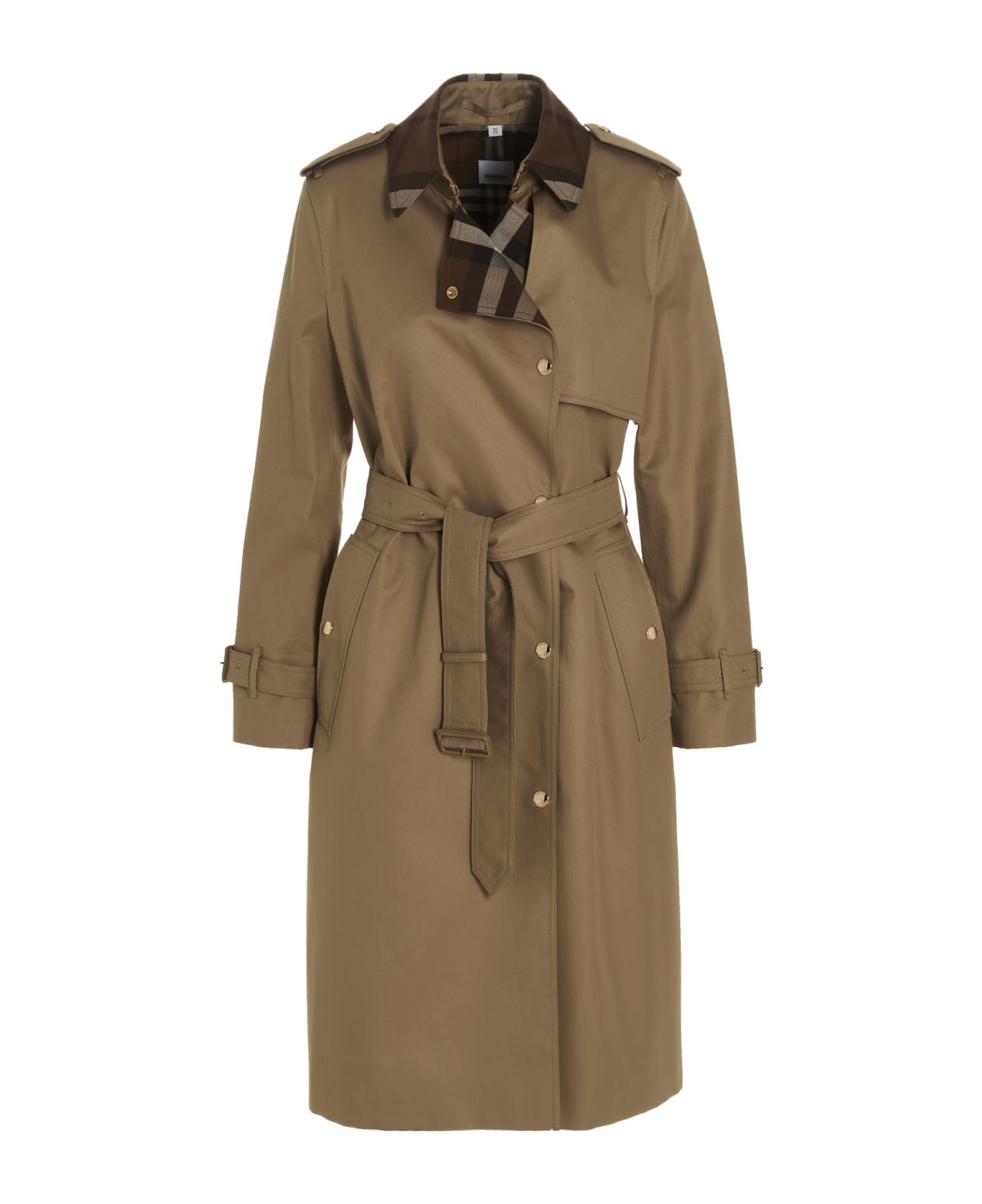 Sandridge' cashmere gabardine cotton trench coat adorned with Check Exaggerated tartan pattern on the collar and lapels, one-button closure, snap button welt pockets, back split with snap buttons, hook-and-eye collar, windbreak flap, strap cuffs and a rainproof flap.