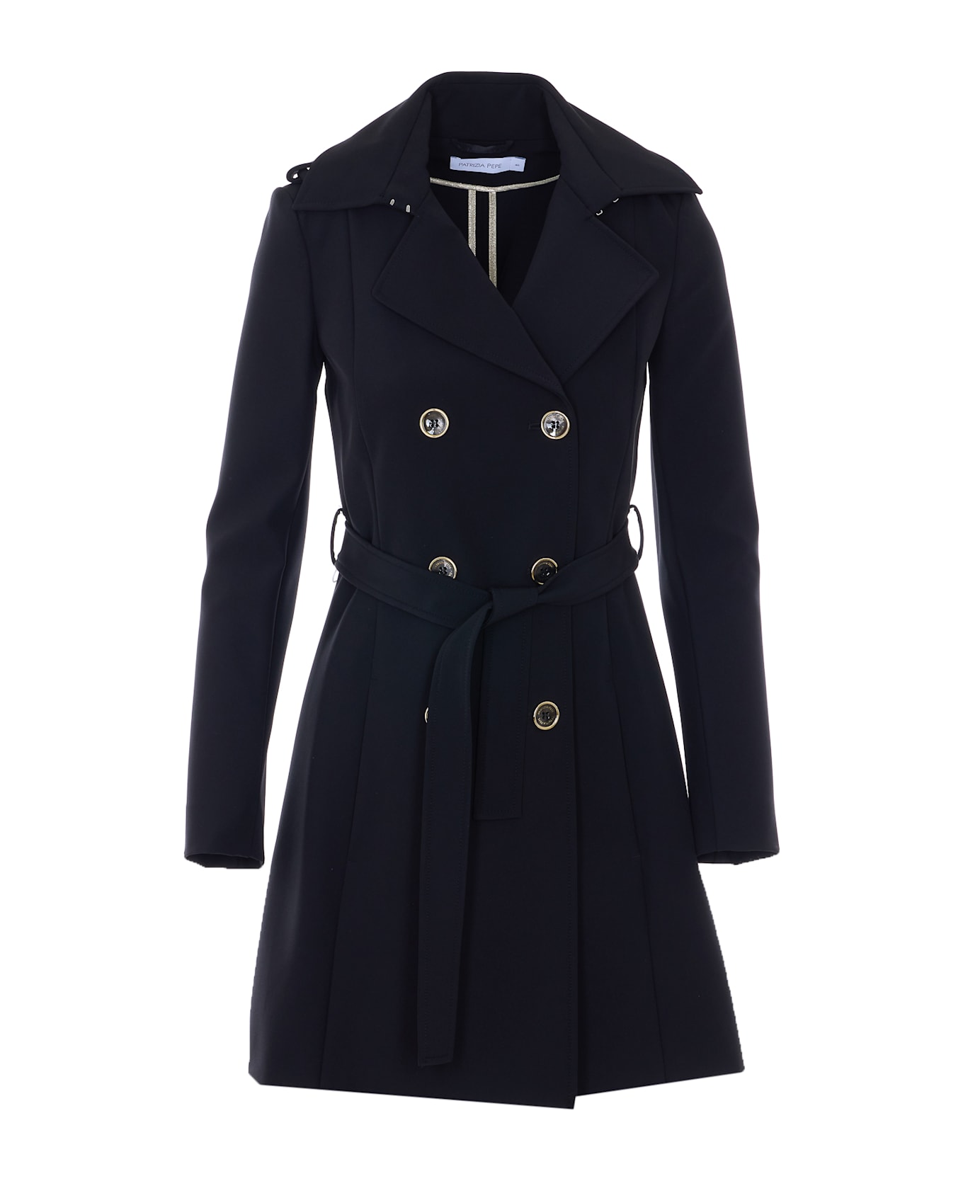 Patrizia Pepe black trench with frontal double breasted buttons closure, belt on waist, lateral pockets, long sleeves
